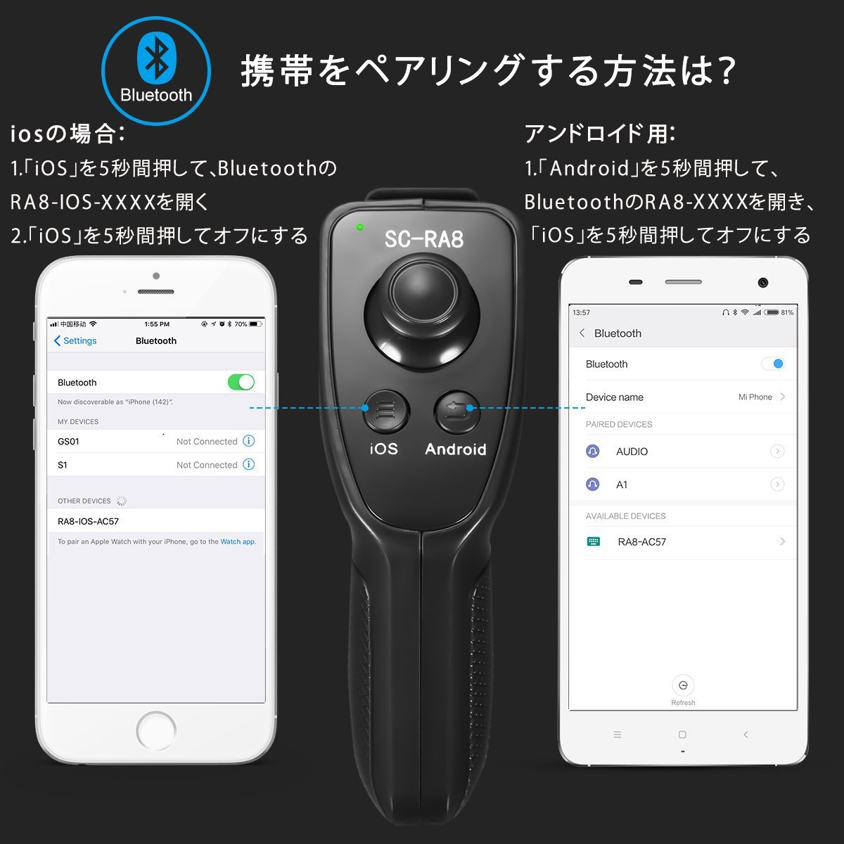 Open / Close: Press the return button for 5 seconds and open it, press the menu button for 5 seconds to close (Bluetooth name: RA8 - XXXX)