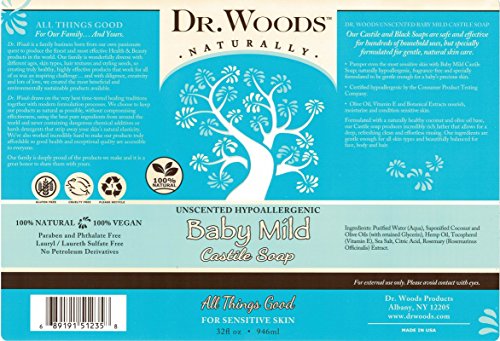 Dr. Woods Unscented Baby Mild Castile Soap is a natural wonder that lifts away tired skin cells to leave your skin smooth, hydrated and exceptionally healthy. Our Unscented Baby Mild Castile Soap formula is a gentle exfoliant and a powerful, acne-fighting deep cleanser that rejuvenates the skin without any need for harsh detergents or toxic additives. This great hypoallergenic soap is also perfect for those with sensitive skin, or looking for the wonderful feeling and benefits of Dr. Woods Castile Soap without the essential oil fragrance.