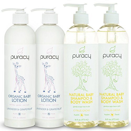-. Feature : TOP CUSTOMER RATED BABY CARE PRODUCTS: Average Amazon Customer Rating of 4.7 stars; Best EWG.org Ingredient Safety Scores (Green Category) / CLINICAL GRADE FORMULAS: Sulfate-Free Natural & Organic Blends Using Clinically Superior Ingredients; NO HARSH CHEMICALS: No triclosan, sulfates, formaldehyde, parabens, phosphates, SLS, SLES, MEA, DEA, TEA, petroleum-based ingredients, animal by-products, gluten, perfumes, dyes, phthalates, or caustics / SAVE 45% OFF MSRP (A $72 value): Bundle Includes (2 bottles) Puracy Citrus Grove Natural Baby Shampoo & Body Wash & (2 bottles) Puracy Lavender & Grapefruit Organic Baby Lotion / 100% SATISFACTION GUARANTEED: They will love it or your money back! Natural, non-toxic, hypoallergenic, vegan, gluten-free, biodegradable; Certified Cruelty-Free - Never Tested on Animals; Made in the USA! / GIFT BOX INCLUDED (pictured): Custom designed to fit these four items so there is no need to rewrap; Select "This is a gift" option at checkout and have Amazon wrap it for you; Box is made in the USA from recycled materials