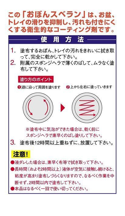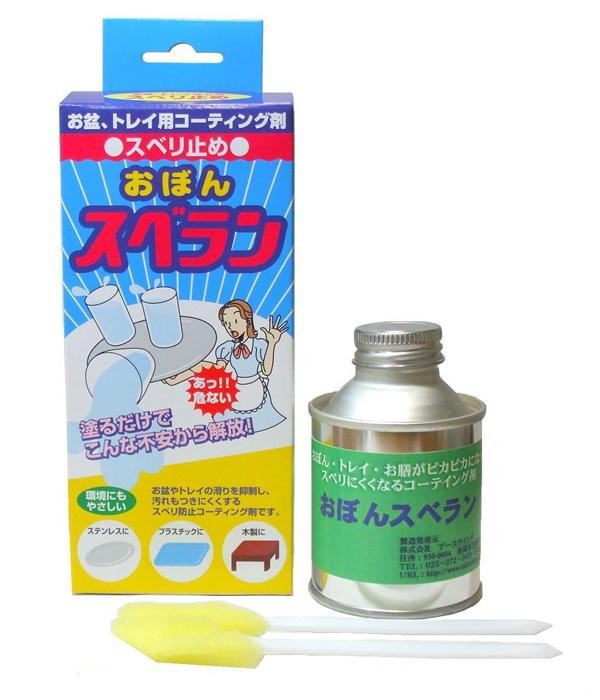 レストランや喫茶店、旅館の配膳などおぼんやトレイで運ぶとき、滑りによってヒヤッとしたり、落としたりした経験はありませんか?この「おぼんスベラン」は、おぼん・トレイ等に塗布するだけで、優れた防滑効果を発揮するコーティング剤です。又、熱に強くキズや汚れもつきにくくするため、衛生的で洗浄もラクになります。おぼん・トレイの転落事故を防ぐために、ぜひご使用ください。 |