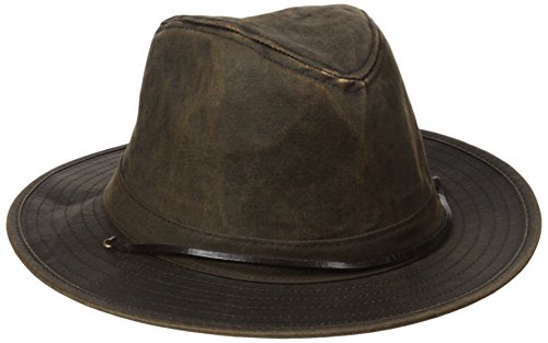 Product DescriptionMen's three in brim sun hat with a distressed wax cloth and leather chin cord0