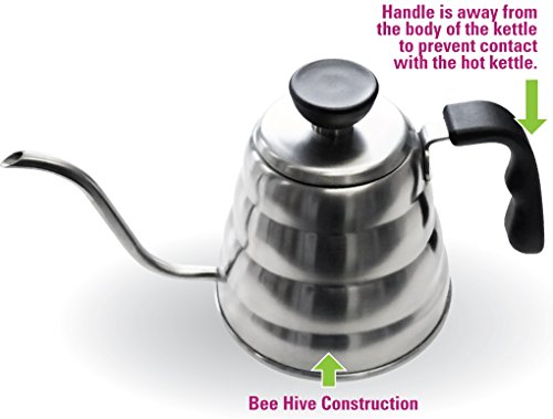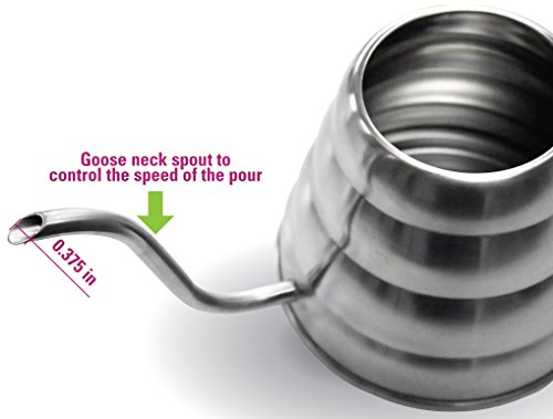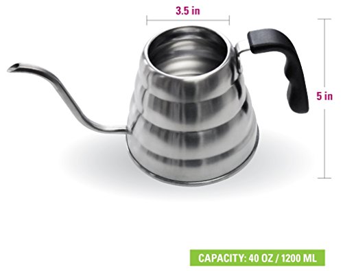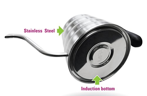 -. Brand : MIRA Brands -. Color : Stainless Steel -. EAN : 0025706870085 -. Feature : Convenient, lightweight design that is the perfect size. Capacity of 33 Oz of liquid, or roughly 4 cups. / Goose-neck spout perfect for easy, smooth and precise pouring, resulting in a great cup of coffee. / Angled handle is away from the flame. Handle made from a high -temperature - BPA free material. / Safe for use on gas, electric stove-tops and is dish-washer safe. Made from Stainless Steel. / Perfect gift for at-home baristas and coffee and tea enthusiasts. -. Label : Mira Brands -. Manufacturer : Mira Brands -. Model : CP-IND-202 -. ProductGroup : Kitchen -. ProductTypeName : KITCHEN -. Publisher : Mira Brands -. Size : 1200ml Pour Over Kettle for Regular and Induction -. Studio : Mira Brands -. Title : MIRA Pour Over Kettle for Coffee and Tea, Works on Regular and Induction Stoves, 40 oz, Stainless Steel -. UPC : 025706870085