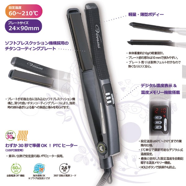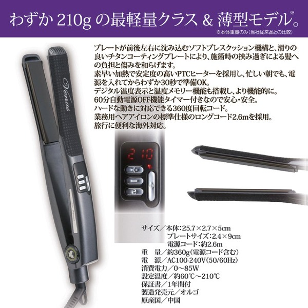 プレートが前後左右に沈み込むソフトプレスクッション機構と、滑りの良いチタンコーティングプレートにより、施術時の挟み過ぎによる髪への負担と傷みを和らげます。素早い加熱で安定度の高いPTCヒーターを採用し、忙しい朝でも、電源を入れてからわずか30秒で準備OK。デジタル温度表示と温度メモリー機能も搭載し、より機能的に。60分自動電源OFF機能タイマー付きなので安心・安全。ハードな動きに対応できる360度回転コード。業務用ヘアアイロンの標準仕様のロングコード2.6mを採用。旅行に便利な海外対応。
