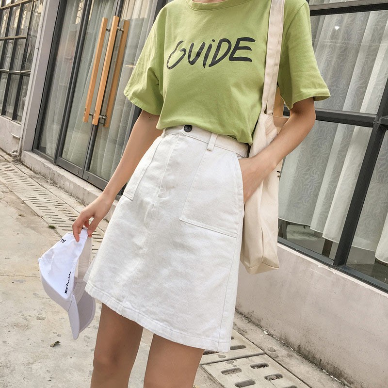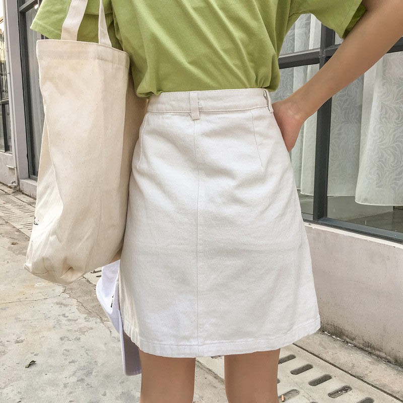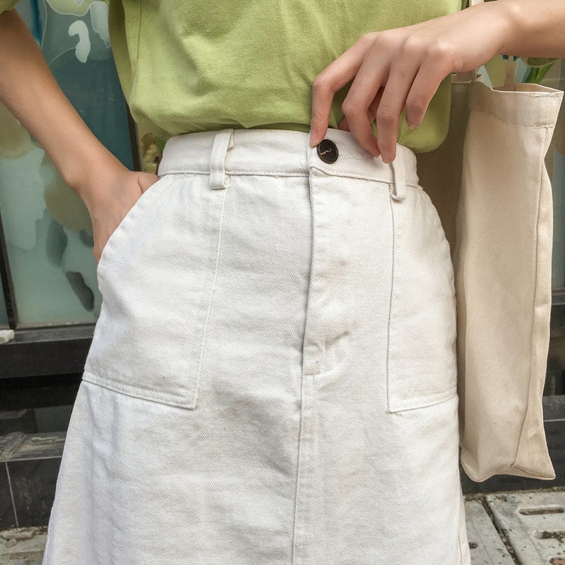 シンプルな前ボタン・前ポケット・ひざ上丈のホワイトデニムスカート♪