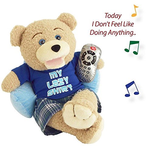 -. Feature : 12" Light brown fuzzy bear reclining and channel surfing. / Dressed in in PJ pants and My lazy Shirt / Mouth moves and TV remote lights up, as he taps his toes to the rhythm / sings the hit Bruno Mars tune, "The Lazy Song".
