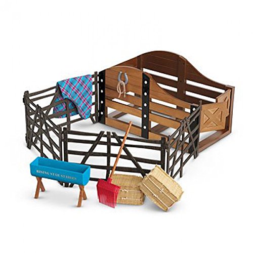 My American Girl® dolls can care for their horses with this stable set. This rustic set comes with plenty of supplies to keep American Girl® horses happy and healthy: A stable with doors that swing open, faux bolt details, and an attached horseshoe that doubles as a hook Four fence pieces snap together to create a cozy corral A plaid blanket and a lead rope for the horses A pretend water trough and two faux hay bales for mealtime A stable fork to keep things tidy.