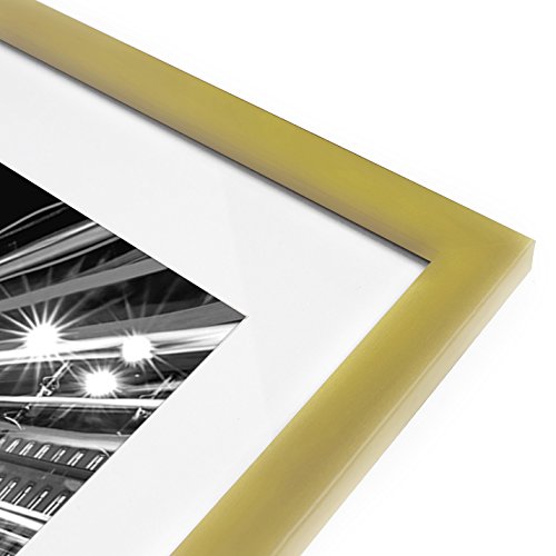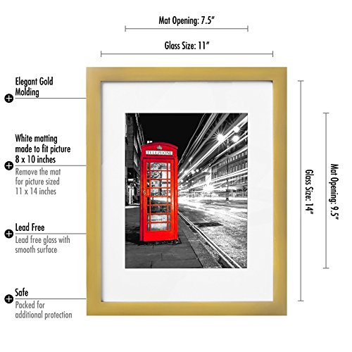 -. Binding : Kitchen -. Brand : AMERICANFLAT -. Color : Gold -. EAN : 0758381223869 -. Feature : ELEGANT EUROPEAN DESIGN: 11x14 inch Gold Colored Picture Frame Made to Display Pictures 8x10-inch with Mat or 11x14-inch Without Mat. No assembly required ready-to-hang. / HIGHEST QUALITY MATERIAL: Ideal for photos sized 11x14-Inches without the Mat and 8x10-Inches with the Mat; perfect for almost all shadow-box projects. Comes with easy opening tabs at the back for easy access. / ATTRACTIVE LOOK: Cream colored mat keeps photos and artwork looking great for years to come. Turn your posed portraits, artful P.R.Ints, and everyday shots into a spectacular display. The actual mat opening is 7.5x9.5 inches. It is designed to hold a 8x10 inch photo in place. We recommend taping the photo to the back of the mat. / PERFECT FOR HOME OR OFFICE: Gold in color with sturdy glass front, and comes with hanging hardware already assembled. Extremely carefully packaged to avoid damage in transit. / PROTECTIVE PACKAGING: Americanflat developed packaging that helps ensure safe delivery of fragile and glass items. Order with confidence, click and add to cart today. -. IsAdultProduct : 0 -. Label : Americanflat -. Manufacturer : Americanflat -. Model : MW1114GLD810 -. MPN : MW1114GD810 -. PackageQuantity : 1 -. PartNumber : MW1114GD810 -. ProductGroup : Home -. ProductTypeName : KITCHEN -. Publisher : Americanflat -. Size : 11x14 inch -. Studio : Americanflat -. Title : 11x14 Gold Picture Frame - Made to Display Pictures 8x10 with Mat or 11x14 Without Mat - Wall Mounting Material Included -. UPC : 758381223869