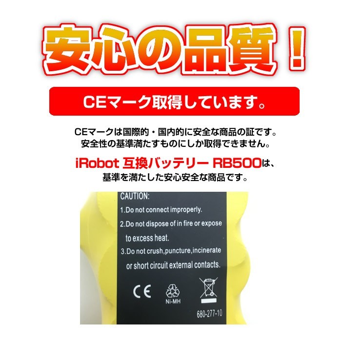 ■ 認証 : CEマーク取得済<セット内容>iRobot RB500対応 互換バッテリー 1個