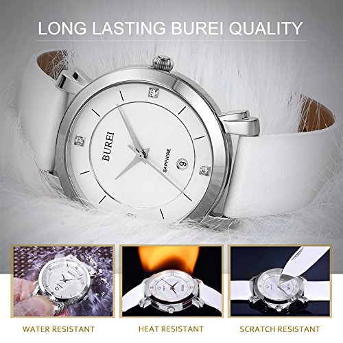 BUREI(바오쇼)손목시계 레이디스 브랜드 인기 패션 방수 아날로그 날짜 표시 스탠다드 항균 가공 화이트 가죽 밴드 쿼츠 워치(화이트)