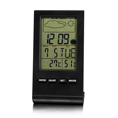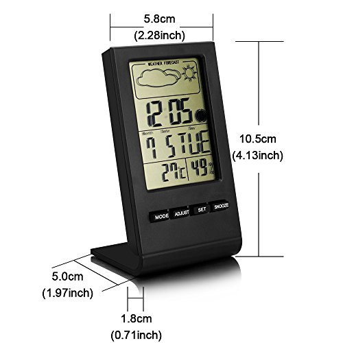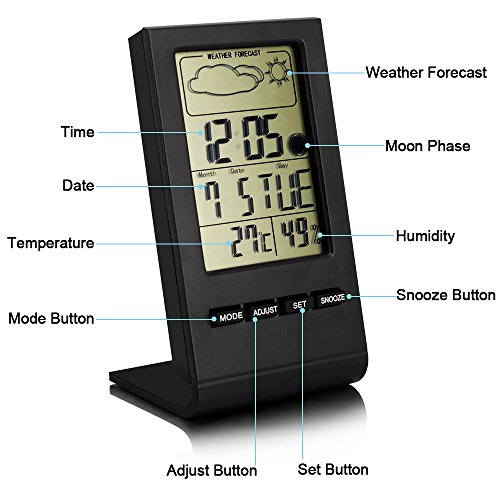 -. Feature : Easy to read: jumbo LCD display for better viewing across the room / Measures indoor temperature (Fahrenheit or Celsius) and humidity / Alarm clock: 12/24 hours mechanism clock and hourly chime (can be set) / Snooze Function: the alarm rings every 5 minutes until switched off. / Multi-function: Weather Station/ Alarm Clock/ Moon Phase/ Calendar/ Temperature Display.