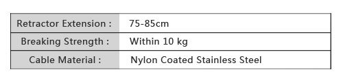 -. Feature : Retractor Extension:75-85cm / Breaking Strength:within 10kg / Cable Material:nylon coated stainless steel