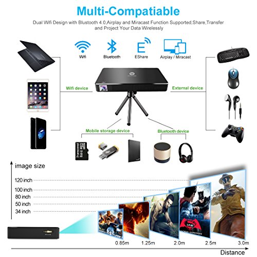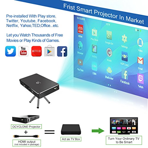 【Smart】: OCYCLONE T3 mini wiress projector built in Android 4.4 operating system, support Bluetooth, HDMI, APP installation and playing movies with Wifi, could connect to both Android phone and iPhone.