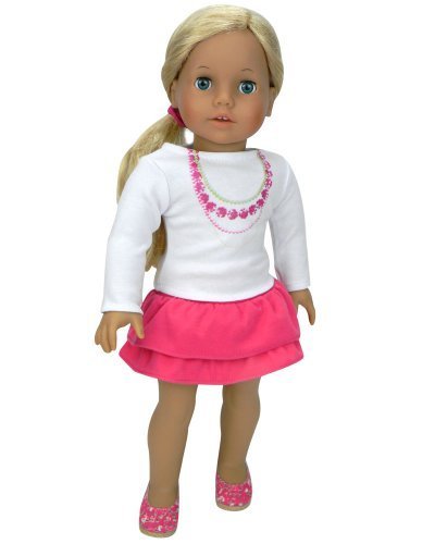 -. Title : 18 Inch Doll Clothing 2 Pc. Set of Stylish Top and Ruffled Skirt Fits American Girl & More! 18 Inch White Long Sleeve Necklace Tee with Hot Pink Tiered Skirt