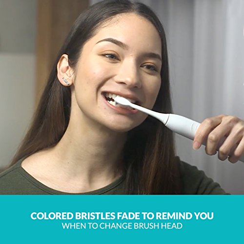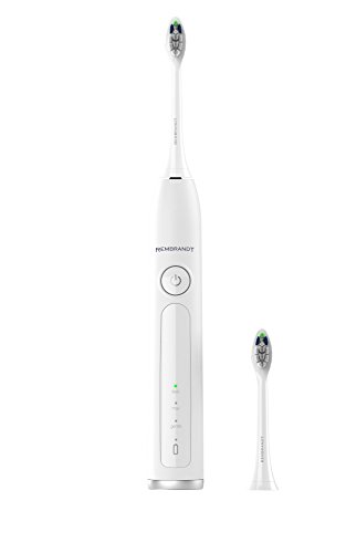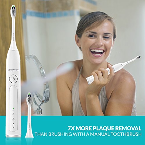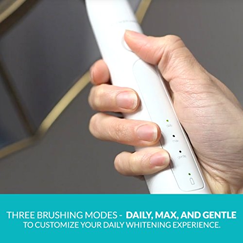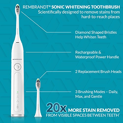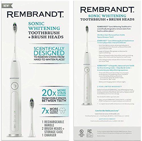 The Rembrandt Sonic Whitening Toothbrush is scientifically designed to remove stains from hard-to-whiten places like the sides and backs of your teeth. Designed to remove 20x more stains from the visible spaces between your teeth and provide 7x more plaque removal than a manual toothbrush, the Rembrandt sonic brush is a must-have for at-home teeth whitening and daily cleaning. Combined with Rembrandt Deeply White or Intense Stain toothpaste, the Sonic Fluid Motion from the toothbrush assists in removing stains from the tooth surface and spaces between teeth. The large tuft design of the brush heads offers greater surface area and the diamond shaped bristles help whiten teeth by polishing away surface stains. Plus, the brush heads have color fading bristles that let you know when it's time to change your brush head. The toothbrush also features a rechargeable, waterproof handle with three brushing modes - Daily, Max and Gentle - to customize your daily whitening experience. The handle also has a 30 second timer alert to help ensure proper brushing time in all quadrants of your mouth, along with a 2 minute timer for Daily and Gentle modes, and 3 minute timer for Max mode. When used with Rembrandt Deeply White or Intense Stain toothpaste versus regular toothpaste and toothbrush vs. a regular manual toothbrush based on in vitro laboratory testingFeature