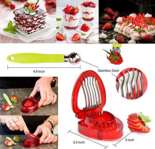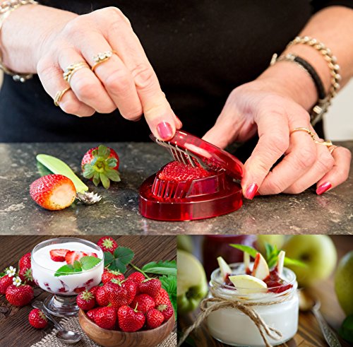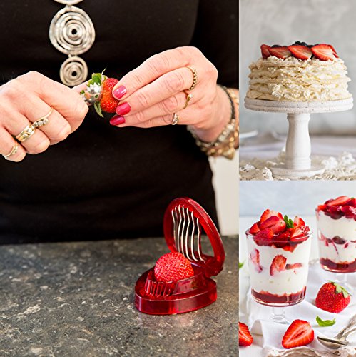 For perfectly sliced strawberries place strawberry into slicer and push down gently, use same for hulling your Tomatoes, for larger berries cut fruit in half first. To fan a strawberry place with pointed end up and gently cut through ¾ of the strawberry remove from slicer and gently press on an angle to make a fan.