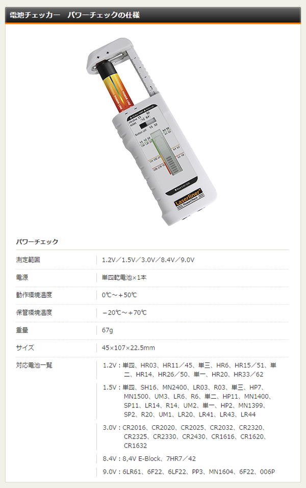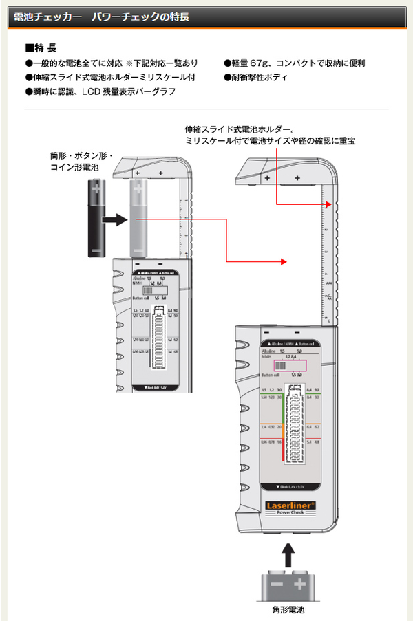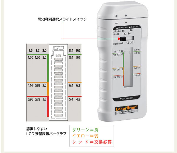 【商品名】 電池チェッカー(バッテリーテスター/環境測定器) ウマレックス 軽量/コンパクト/耐衝撃 【日本正規品】 パワーチェック 【ジャンル・特徴】 UMAREX 環境測定器/乾電池チェッカー 単1 単2 単3 ■サイズ・色違い・関連商品■電池チェッカー パワーチェック[当ページ]■距離計 ロールパイロットミニ■スピードガン スピードスターV■照度計 ルクステストマスター■風速計 エアーフローテストマスター■騒音計 サウンドテストマスター■膜厚計 コーティングテストマスター関連商品の検索結果一覧はこちら 環境測定器 ウマレックス パワーチェック■商品スペック製造元 : ウマレックス(ドイツ)ルパン3世で御馴染みのワルサー社をグループに持つ 建築向け小型機器への開発には注目株の欧州ブランド電池チェッカーパワーチェックPowerCheck筒形・角形・ボタン形・コイン形電池。パワーチェック1台で残量を視覚的にチェック。認識しやすい3色表示のLCD残量表示バーグラフと簡単伸縮スライドの電池ホルダーで瞬時に確認。●一般的な電池全てに対応 ※下記対応一覧あり ●伸縮スライド式電池ホルダーミリ