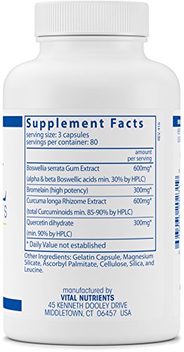 ReleaseDate : 2015-07-01 Studio : Vital Nutrients Publisher : Vital Nutrients Binding : Health and Beauty Product Description BCQ® combines Boswellia and Curcumin extracts with Quercetin, a potent flavonoid, and Bromelain, a proteolytic enzyme derived from the pineapple plant. This powerful formula provides antioxidants and may help reduce substance P levels in the body. In addition, BCQ supports a healthy inflammatory response, which may aid in reducing minor pain. The nutrients in this distinctive formula are also known to support gastrointestinal function and help maintain healthy connective tissue Vital Nutrients mission is to manufacture superior quality nutraceuticals that exceed both industry and government standards and provide clinically effective results. They provide over 200 science-based and clinically effective products. They have a comprehensive quality assurance program to ensure that purity and potency is consistently met on every product that they manufacture. Vital Nutrients uses independent U.S. ethical laboratories to test all raw materials and finished products. Each raw material is tested, regardless of origin, for purity and potency. All finished products are tested through a real time stability protocol for expiration date validation. They are an FDA Inspected facility that exceeds FDA cGMPs, and a member of the NPA. 0