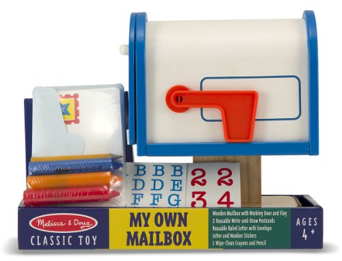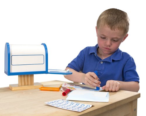 - Feature : Wooden mailbox with working door and flag / Includes 2 reusable write-and-draw postcards, reusable ruled letter with envelope, letter and number stickers, 3 wipe-clean crayons and pencil / Activity ideas included to inspire learning and fun / Durable wooden construction / Helps teach color recognition and pre-literacy skills, encourages fine motor skills and imaginative play