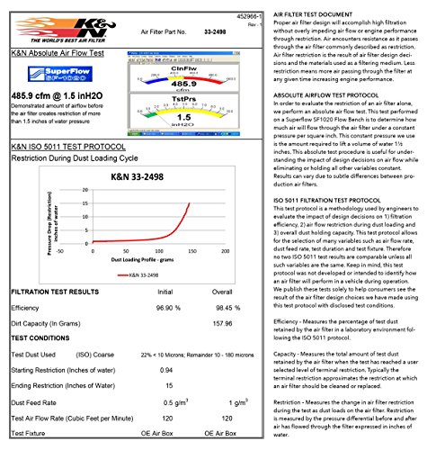 -. Binding : Automotive -. Brand : K&N -. EAN : 0024844340818 -. Feature : Designed to boost horsepower and rate of acceleration / Can be cleaned and used again / High air flow with exceptional filtration / Lasts up to 50,000 miles before cleaning is required depending on driving conditions / Works with original equipment manufacturer vehicle electronics -. IsAutographed : 0 -. IsMemorabilia : 0 -. Label : K&N Engineering -. Manufacturer : K&N Engineering -. ManufacturerPartsWarrantyDescription : Parts -. Model : 33-2498 -. MPN : 33-2498 -. NumberOfItems : 1 -. PackageQuantity : 1 -. PartNumber : 33-2498 -. ProductGroup : Automotive Parts and Accessories -. ProductTypeName : AUTO_PART -. Publisher : K&N Engineering -. ReleaseDate : 2013-10-24 -. Studio : K&N Engineering -. Title : K&N 33-2498 Replacement Air Filter -. UPC : 024844340818 -. Warranty : 1,000,000 Miles