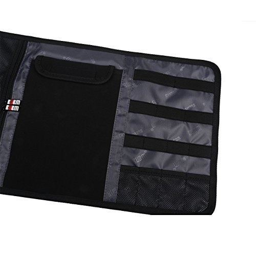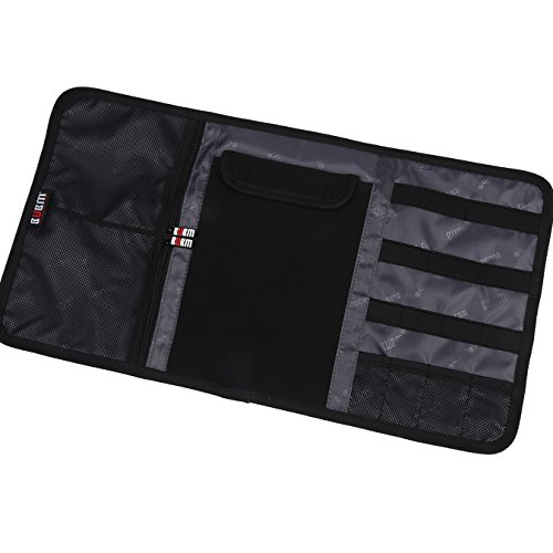 Feature : This electronics organizer bag is a great addition to your organization arsenal. You can keep all my odds and ends of electronic ownership in one place and at your fingertips while on the go. Keep everything organized instead of having everything in your bag or desk / The outside of this organizer is a heavy-duty black nylon and has a heavy-duty ribbon type 3/8" wide closure that wraps around the organizer when folded closed and has a heavy-duty clasp / The inside is a softer nylon. The left side has two zippered mesh compartments great to hold a cell phone, keys, coupons, etc. The other compartment has elastic straps to hold cords, mp3 players, chargers, headphones, back up batteries, plugs, etc. The middle compartment is a well padded pouch with a velcroed flap and measures 8 1/2" x 6". Perfect for your mini iPad, iPhone, iPod or smaller Kindle, depending on how big of case they are in / Opened up it measures 19" x 10 1/4". When closed (folded in thirds) it measures 6 1/2" x 10 1/4". No bigger than a clutch purse, so it can fit easily into any suitcase, large purse, or computer bag / The whole case is sewn well, with covered seams and edges and straight stitching. Overall this is a great traveling accessory to have and keep track of all your small electronics accessories