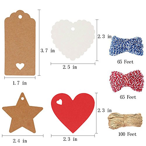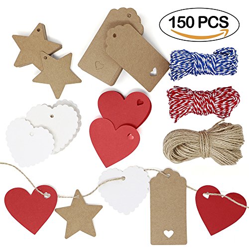 VAMAI Kraft Paper Gift Tags 150 PCs with 230 Feet Cotton String Jute Twine Shaped Heart Star Rectangle Blank Brown Hanging Tag for Mother's Day