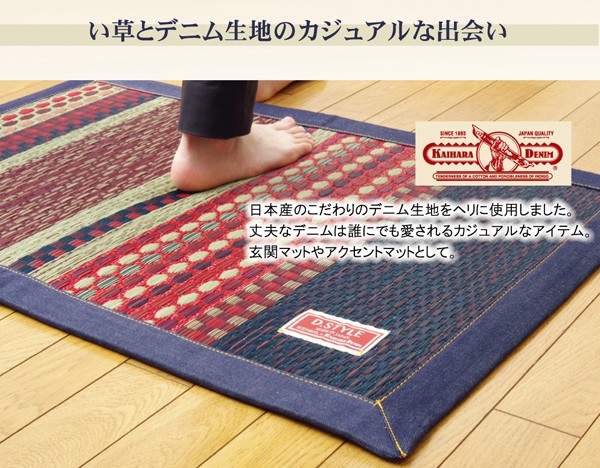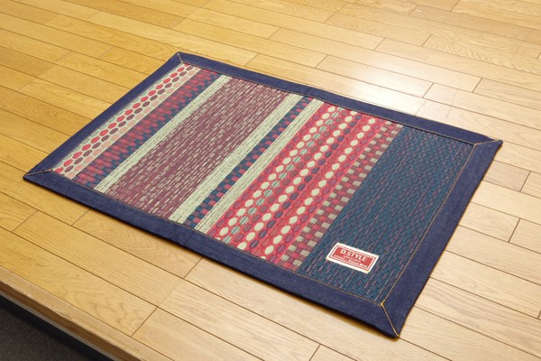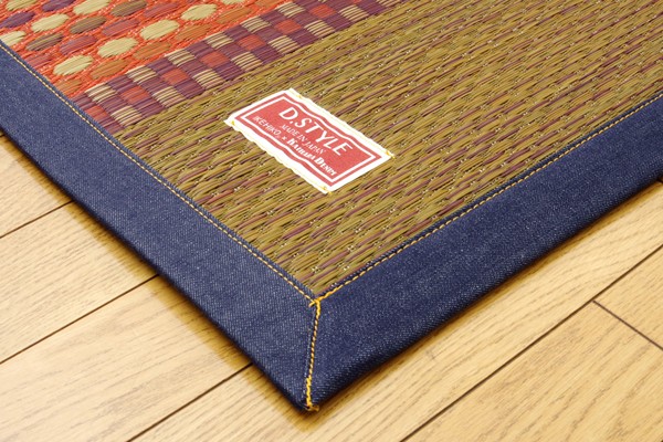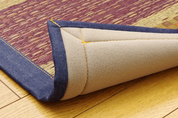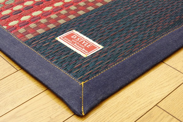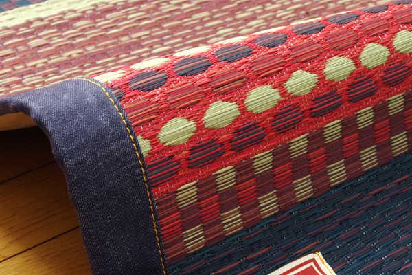 広島県福山市のデニム生地メーカー、カイハラ(株)の生地をヘリで使いました。イ草生地は袋織りという技法で繊細な柄を出しています。折れ曲がりが複雑なので長いイ草を使用しないと切れてしまいます。縦糸が密なので、しっかりとして破れにくいのが特徴です。国産(九州産)のい草を使用しています。一本一本が太く、表皮が厚く繊維がキメ細かいので弾力性があり、耐久性に優れています。い草には空気の自然浄化作用、湿度の調節作用などがあります。い草に青森ヒバ加工を施しています。(抗菌、防臭効果)