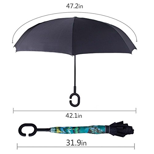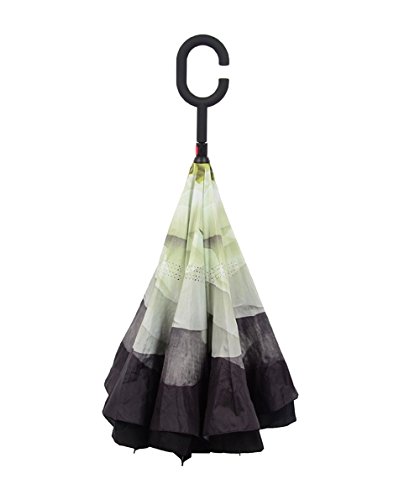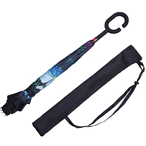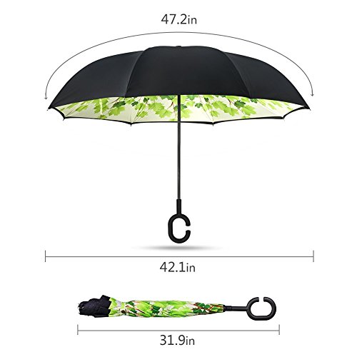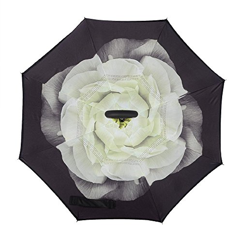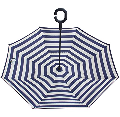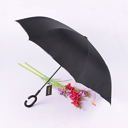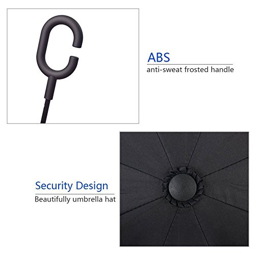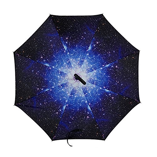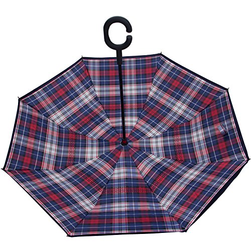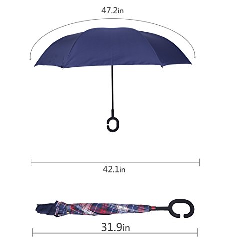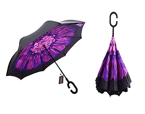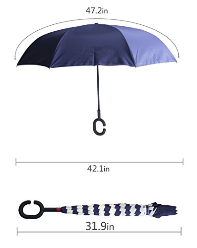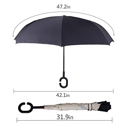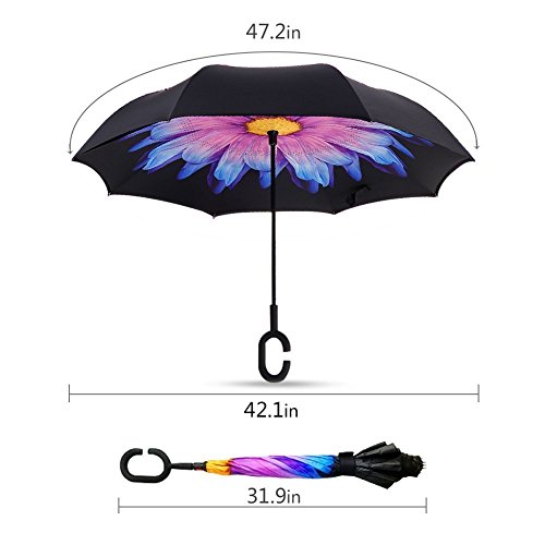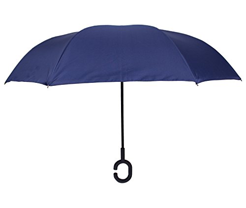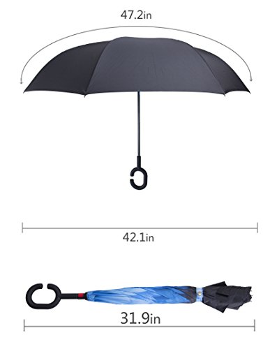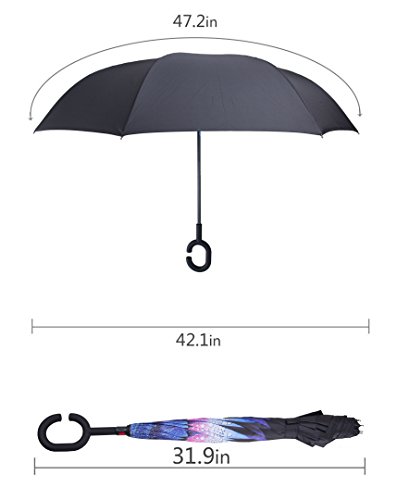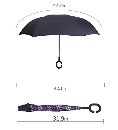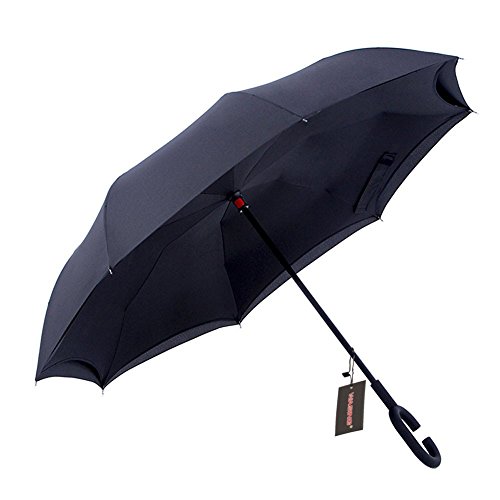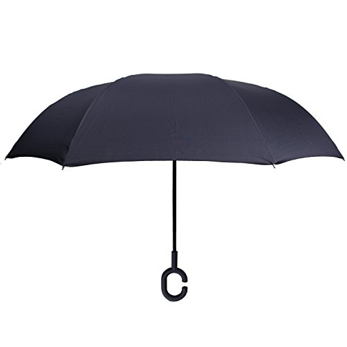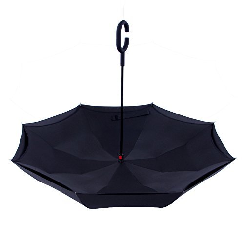 Have you ever encountered such a problem in rainy days? When you jump on a crowded train after escaping a downpour your dripping wet umbrella usually brushes up against your bag, your clothes or -even worse- a stranger. But by inverting the design, the wet side of the umbrella faces inward when closed, exposing only the dry side. And that's not all: the creative design makes it easier to open when coming out of a car or other covered area, and when not in use the umbrella can stands up on its own! Double layer Inverted umbrella Unique design double layer inside out umbrella, make it easy for you on raining day, won??t wet your car, documents or others. Advanced double layer ribs made the inverted umbrella more sturdy. 23 in X 8 Panels is large enough for Many People . Easy to Operate and Safe to Use With a simple click of the embedded button, you can open and close the umbrella in confined spaces when entering or exiting a building or car and it's less awkward and more safer to open and close when in crowds, since the danger to poke in people's eyes has been removed by the design. Convenient to place and drip free It can stand up on its own, ideal for when you have nowhere to prop your umbrella up against. It will also keep the wet part of the umbrella inside once you've closed it, so things don't get dripped on when you put it away after coming indoors. Durably windproof The straight umbrella easily slices through all winds. Due to its aerodynamic design, the umbrella always finds the most comfortable position in the wind which makes it exceptionally pleasant to use, even in strong gales. If the canopy flips, it can be rectified at the push of a button. Package Contents: 1 x Inverted umbrella 0