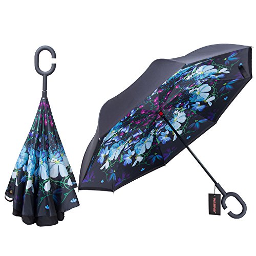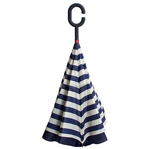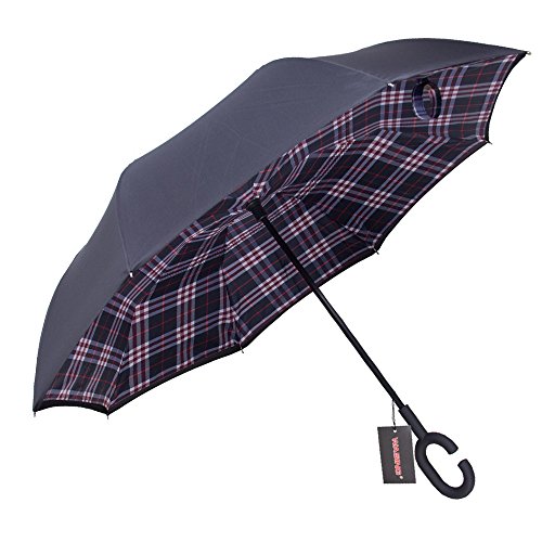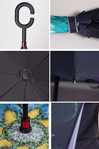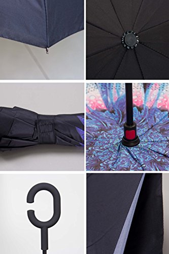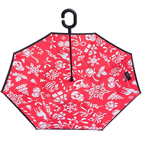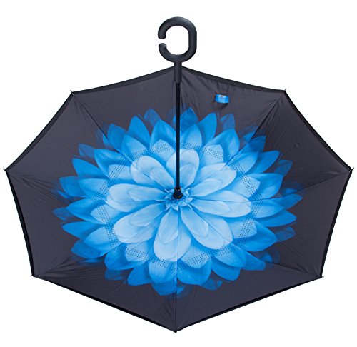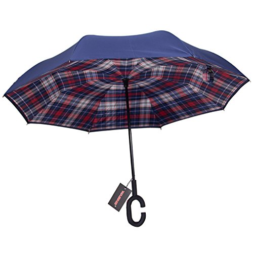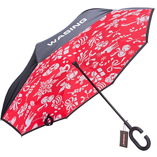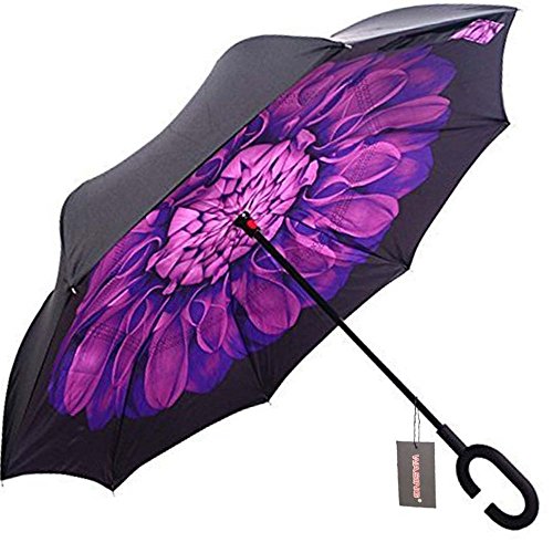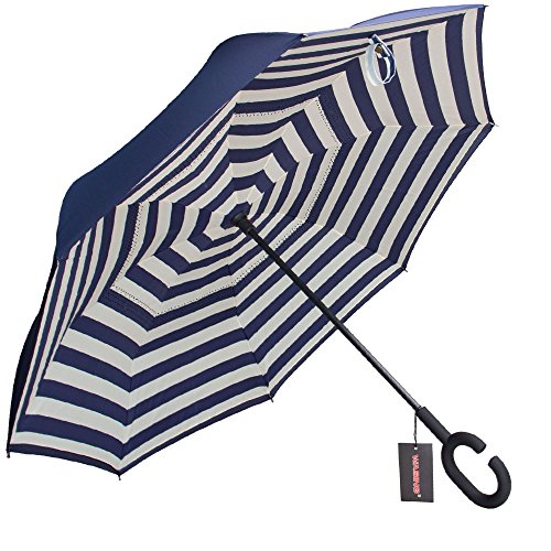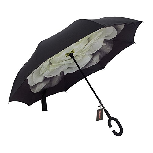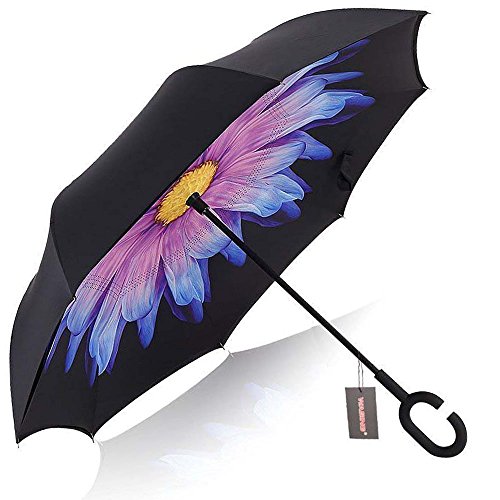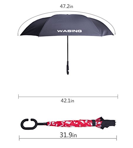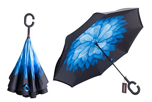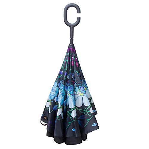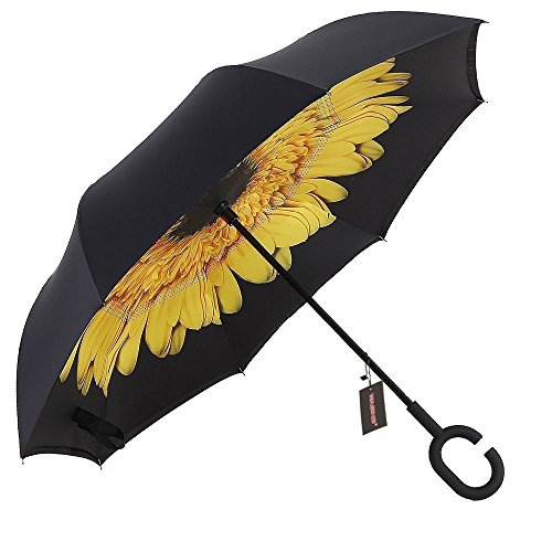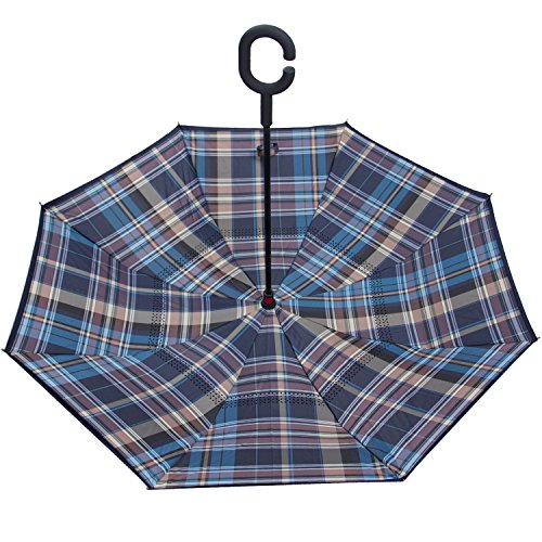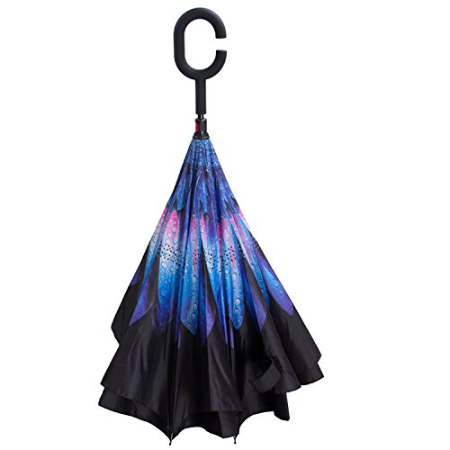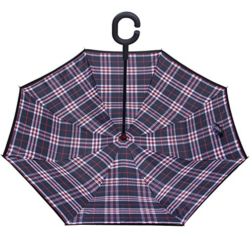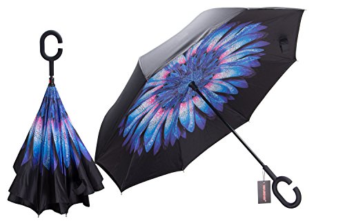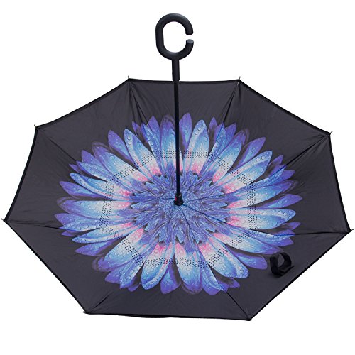 Have you ever encountered such a problem in rainy days? When you jump on a crowded train after escaping a downpour your dripping wet umbrella usually brushes up against your bag, your clothes or -even worse- a stranger. But by inverting the design, the wet side of the umbrella faces inward when closed, exposing only the dry side. And that's not all: the creative design makes it easier to open when coming out of a car or other covered area, and when not in use the umbrella can stands up on its own! Double layer Inverted umbrella Unique design double layer inside out umbrella, make it easy for you on raining day, won??t wet your car, documents or others. Advanced double layer ribs made the inverted umbrella more sturdy. 23 in X 8 Panels is large enough for Many People . Easy to Operate and Safe to Use With a simple click of the embedded button, you can open and close the umbrella in confined spaces when entering or exiting a building or car and it's less awkward and more safer to open and close when in crowds, since the danger to poke in people's eyes has been removed by the design. Convenient to place and drip free It can stand up on its own, ideal for when you have nowhere to prop your umbrella up against. It will also keep the wet part of the umbrella inside once you've closed it, so things don't get dripped on when you put it away after coming indoors. Durably windproof The straight umbrella easily slices through all winds. Due to its aerodynamic design, the umbrella always finds the most comfortable position in the wind which makes it exceptionally pleasant to use, even in strong gales. If the canopy flips, it can be rectified at the push of a button. Package Contents: 1 x Inverted umbrella 0