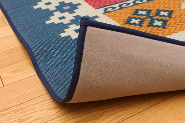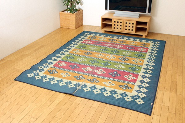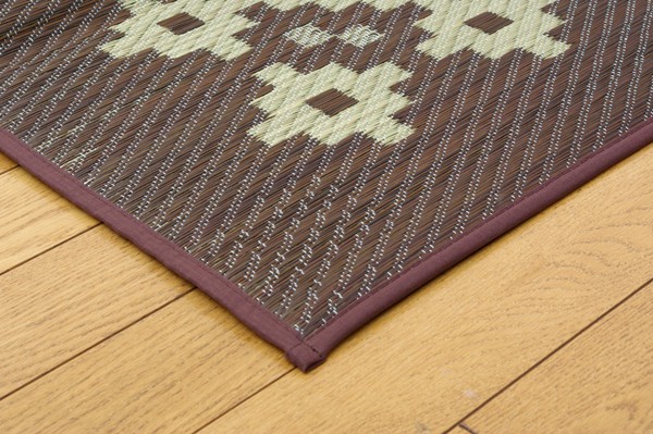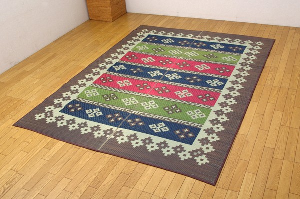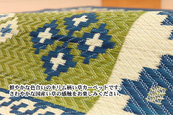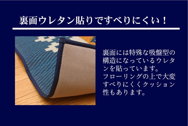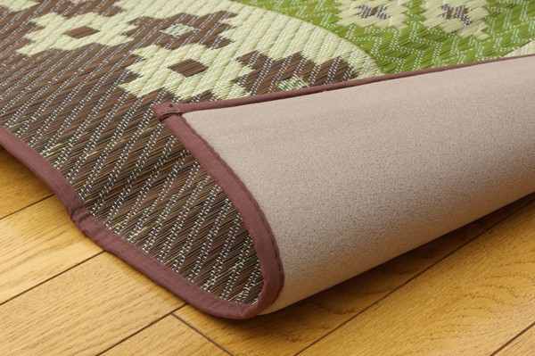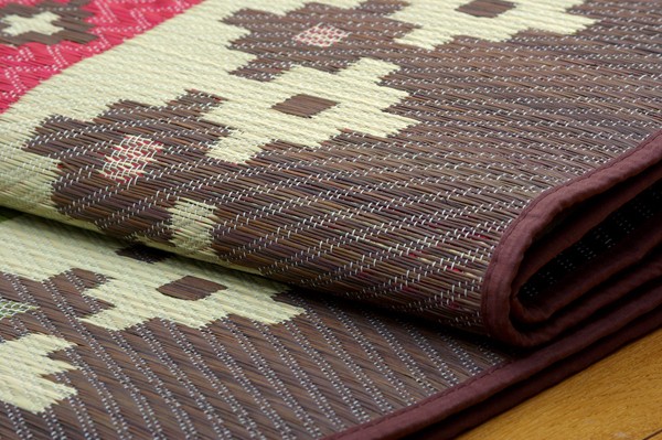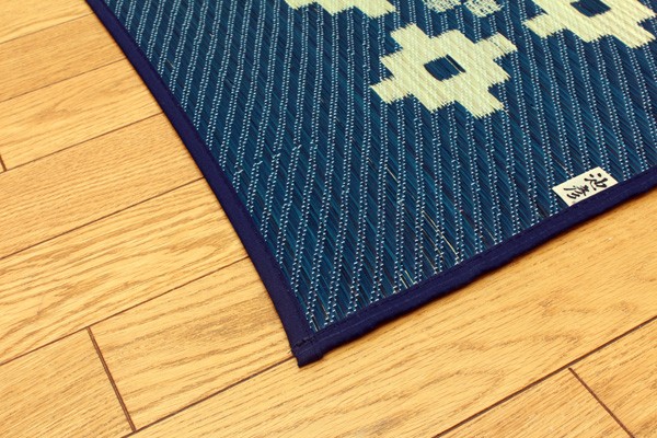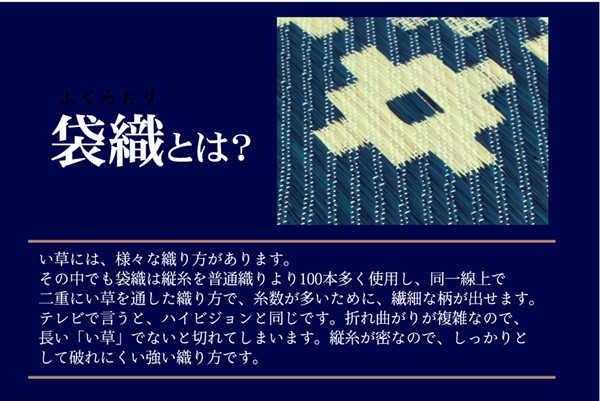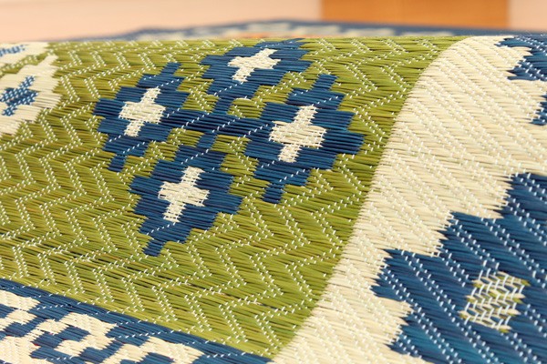 縦糸の本数が多い袋織りという技法で繊細な柄を出しています。折れ曲がりが複雑なので長いイ草を使用しないと切れてしまいます。縦糸が密なので、しっかりとして破れにくいのが特徴です。国産(九州産)のい草を使用しています。一本一本が太く、表皮が厚く繊維がキメ細かいので弾力性があり、耐久性に優れています。い草には空気の自然浄化作用、湿度の調節作用などがあります。また汚れにくく、使用するうちに黄金色に変化し味が出ます。い草に青森ヒバ加工を施しています。(抗菌、防臭効果)裏にはウレタンを貼っていますので適度なクッション性があり、フローリングでのご使用にも適しています。