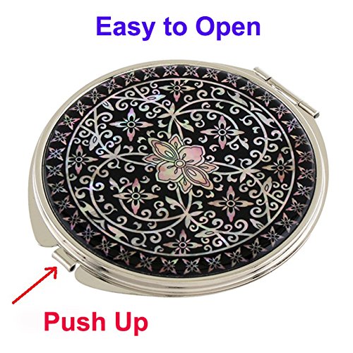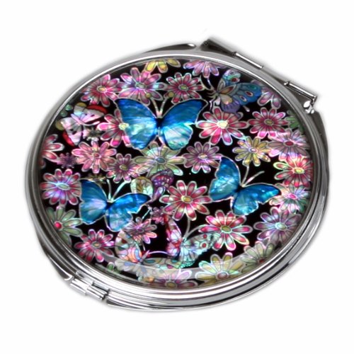 Mother of Pearl Blue Butterfly Design Double Compact Makeup Cosmetic Personal Handbag Purse Mirror, 3.2 Ounce