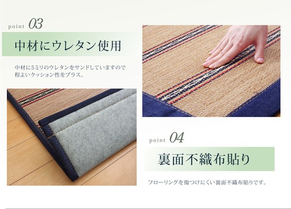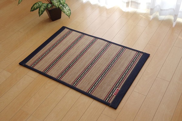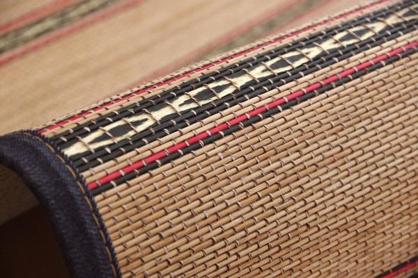 2.5mm+11mm細ヒゴを使用したバンブーラグです。竹は耐久性に優れ、熱伝導率が高いため自然のひんやり感があります。黒く染色した11mmの竹ヒゴにカービング加工(機械でカットし、彫刻のように凹凸をつけた加工)で柄を描き、立体感と高級感を出しました。ヘリにはデニム生地を使用しています。カーペットなのでデニム生地には色落ちをしにくい加工を施しております。ジーンズ感を出すためピスネームも付けております。またクッション性にこだわり、中材にはウレタン5mmを使用しています。裏には不織布を貼っていますので、フローリングでのご使用に適しています。竹は他の木材と比べると、格段に成長が早く(3~5年で成竹)、持続的生産が可能な環境に優しいサスティナブルな素材です。