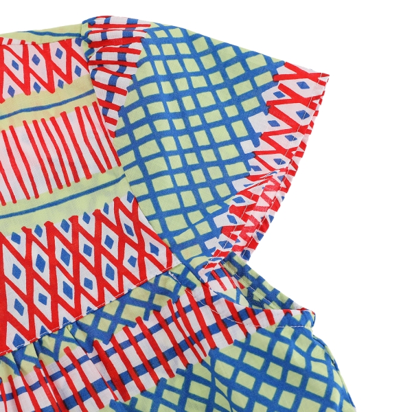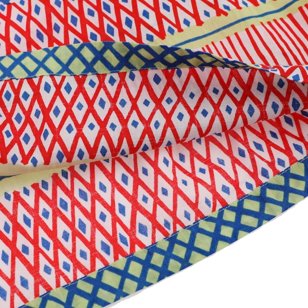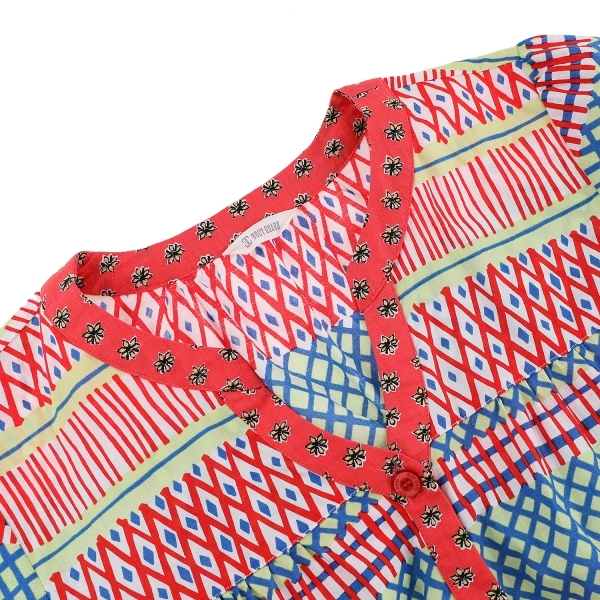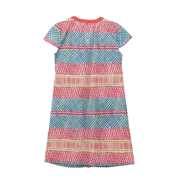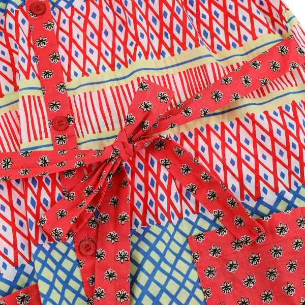 두가지 나염이 믹스된 레드 칼라감의 이지 원피스. 허리폭을 조절 할 수 있는 끈이 매치 되어 있어 앞뒤로 묶을 수 있으며 디자인 포인트가 될 수 있다. 캡 소매 스타일로 진동 부분의 움직임이 불편하지 않고 부담스럽지 않다.