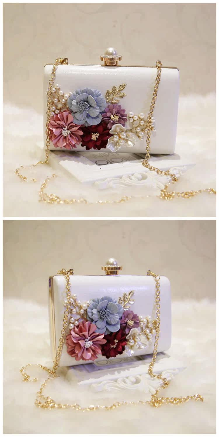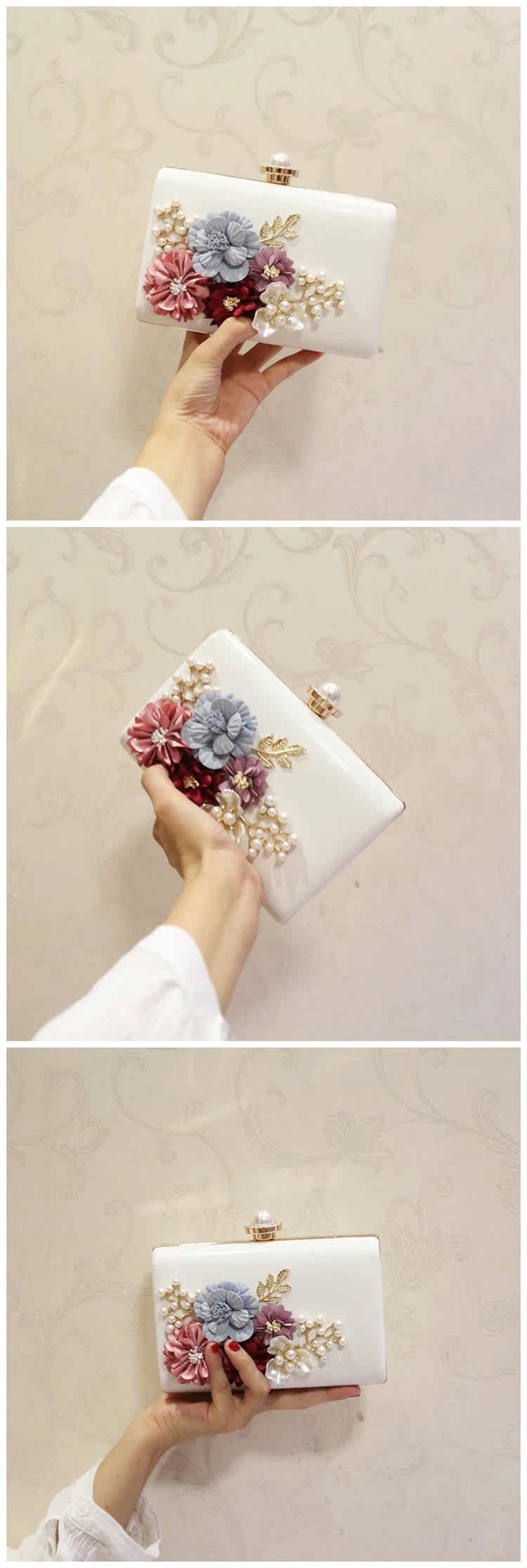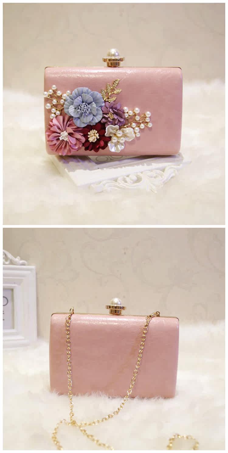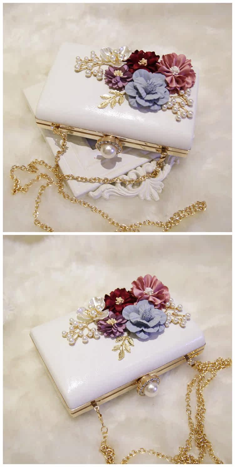 Style: Clutch Take the package way: hand, Messenger, shoulder, wrist Texture: PU Material Technology: soft surface Pick up parts type: chain Put closed the way: magnetic buckle Popular elements: flowers Pattern: plant flowers Is there a mezzanine: none Bags hardness: hard Foldable: No Condition: New Applicable scene: Banquet Style: Japan and South Korea Shape: Square box shape Shoulder strap style: double root