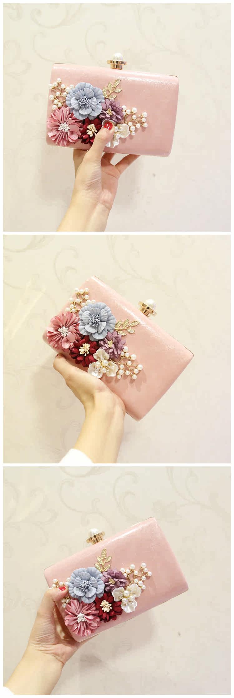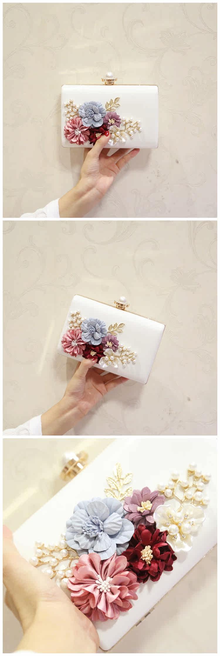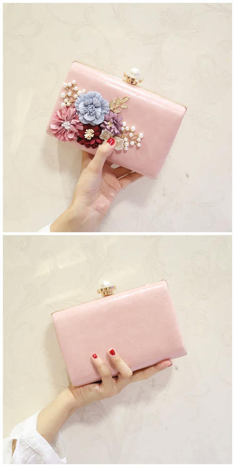 Style: Clutch Take the package way: hand, Messenger, shoulder, wrist Texture: PU Material Technology: soft surface Pick up parts type: chain Put closed the way: magnetic buckle Popular elements: flowers Pattern: plant flowers Is there a mezzanine: none Bags hardness: hard Foldable: No Condition: New Applicable scene: Banquet Style: Japan and South Korea Shape: Square box shape Shoulder strap style: double root