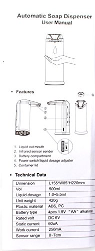 Studio : AZ Trading Publisher : AZ Trading Binding : Toy Product Description Description: The perfect tool for your home! The sensor pump dispenses soap or lotion -- but be sure to keep it simple! To avoid clogging, avoid using soaps that have exfoliates or beads. To clean, wipe the pump with a damp cloth. Do not submerge in water, or use in a shower. Features: Battery Operated (4 "AA" Batteries -- not included) Refill Lid LED Light Liquid Outlet Reaction Port Includes: Automatic Soap Dispenser Recommended Age: 12 Item Code: SD470 Chrome 0