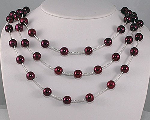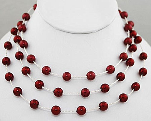 3 rows of cascading Cranberry Redt color pearl look on a beautiful silver plated chain. . The cascading rows fall gently an inch apart on your neck. Necklace can be work for a wedding or worn everyday to dress up a sweater or shirt. Length: 14"- 17" with attached extension. Small Silver Ball at end of extension to hang down the back when worn at 14"s Chain: Silver Plated Herringbone Chain Clasp: Lobster Size of Pearls: 8mm cranberry Pearl every 3/4" on silver chain For Bridesmaids or Formal Events:Feature
