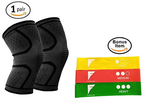 -. Title : FlexLife Brand Compression Knee Sleeve Knee Brace w/ Bonus Item 3ct Resistance Band used to strengthen muscles Pain relief Running, Jogging, Lifting, and Arthritis Premium Knee Sleeves and Braces
