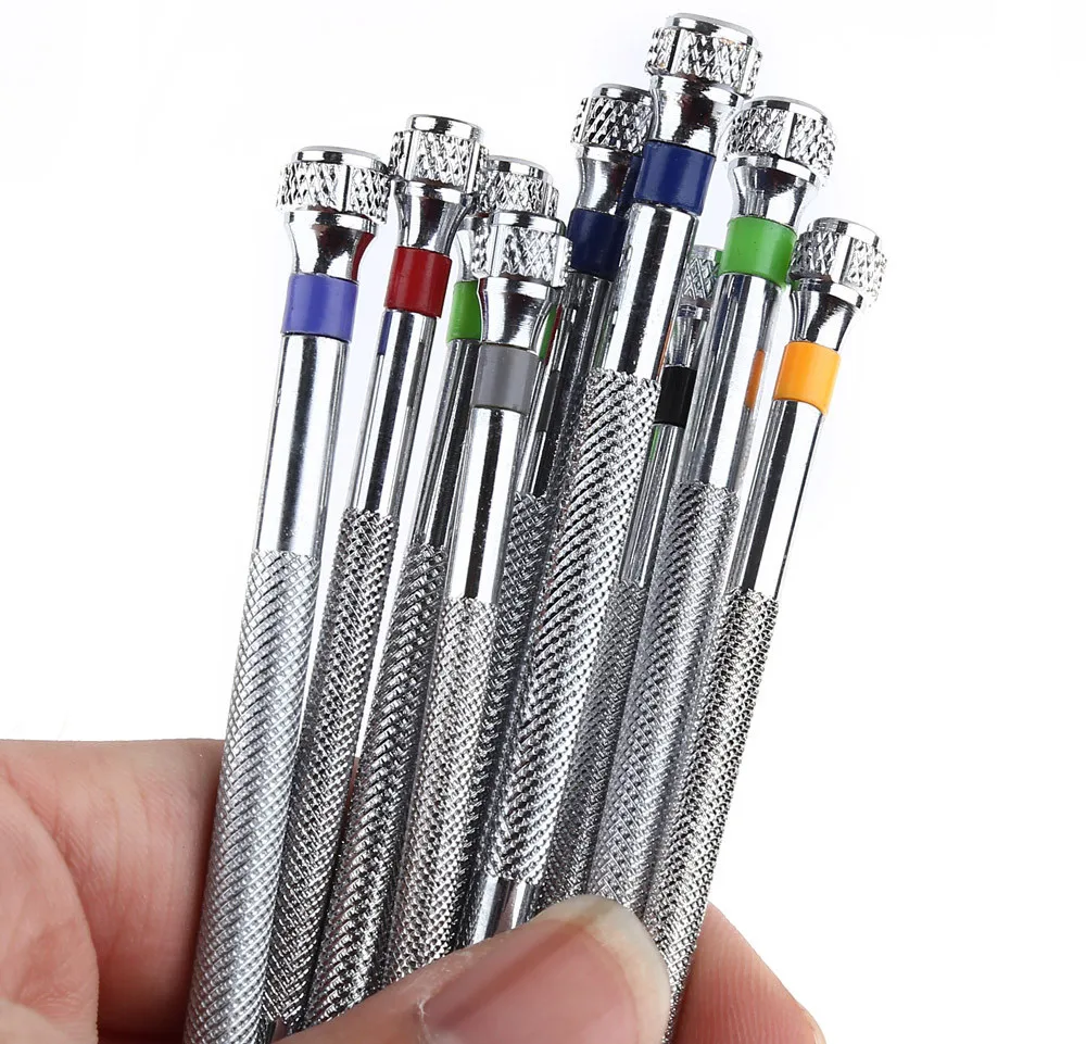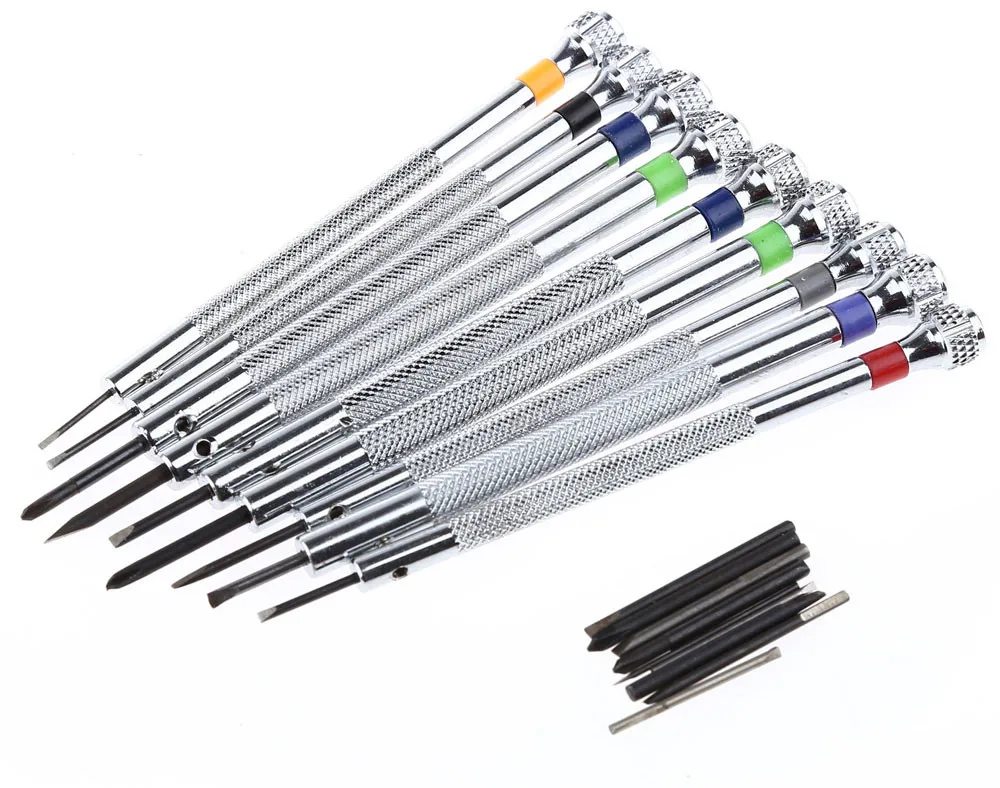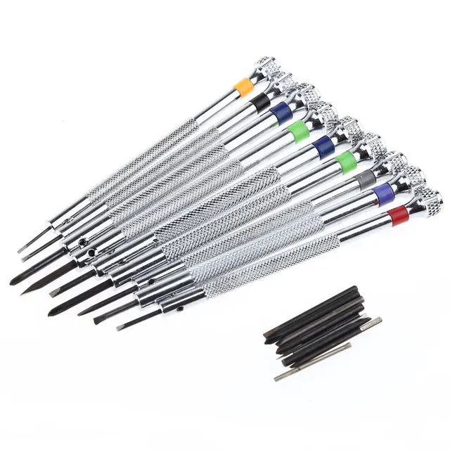 2016 새로운 시계 수리 도구 시계 드라이버 금속 커터 헤드 시계 수리 도구 세트 드라이버 + 스탠드 회전 뜨거운 판매 특징: 금속 커터 헤드 9 싸이즈 드라이버, 그것은 튼튼한 내구성 만족 당신의 다른 수요를. 플라스틱 회전 슬롯 시트 디자인, 편리한 장소. Intagliated 표면, 미끄럼 방지. -완벽한 수리 시계, 안경 프레임 전자 제품. 블레이드 교체 사용할. 도구 설정: 9 개 드라이버, 1 개 스탠드 회전. -일자 드라이버 블레이드 직경: 약 0.6 미리메터, 0.7 미리메터, 0.8 미리메터, 1 미리메터, 1.2 미리메터, 1.4 미리메터, 1.6 미리메터, 1.8 미리메터, 2 미리메터/0.02 인치, 0.027 인치, 0.03 인치, 0.04 인치, 0.05 인치, 0.055 인치, 0.06 인치, 0.07 인치, 0.08 인치.