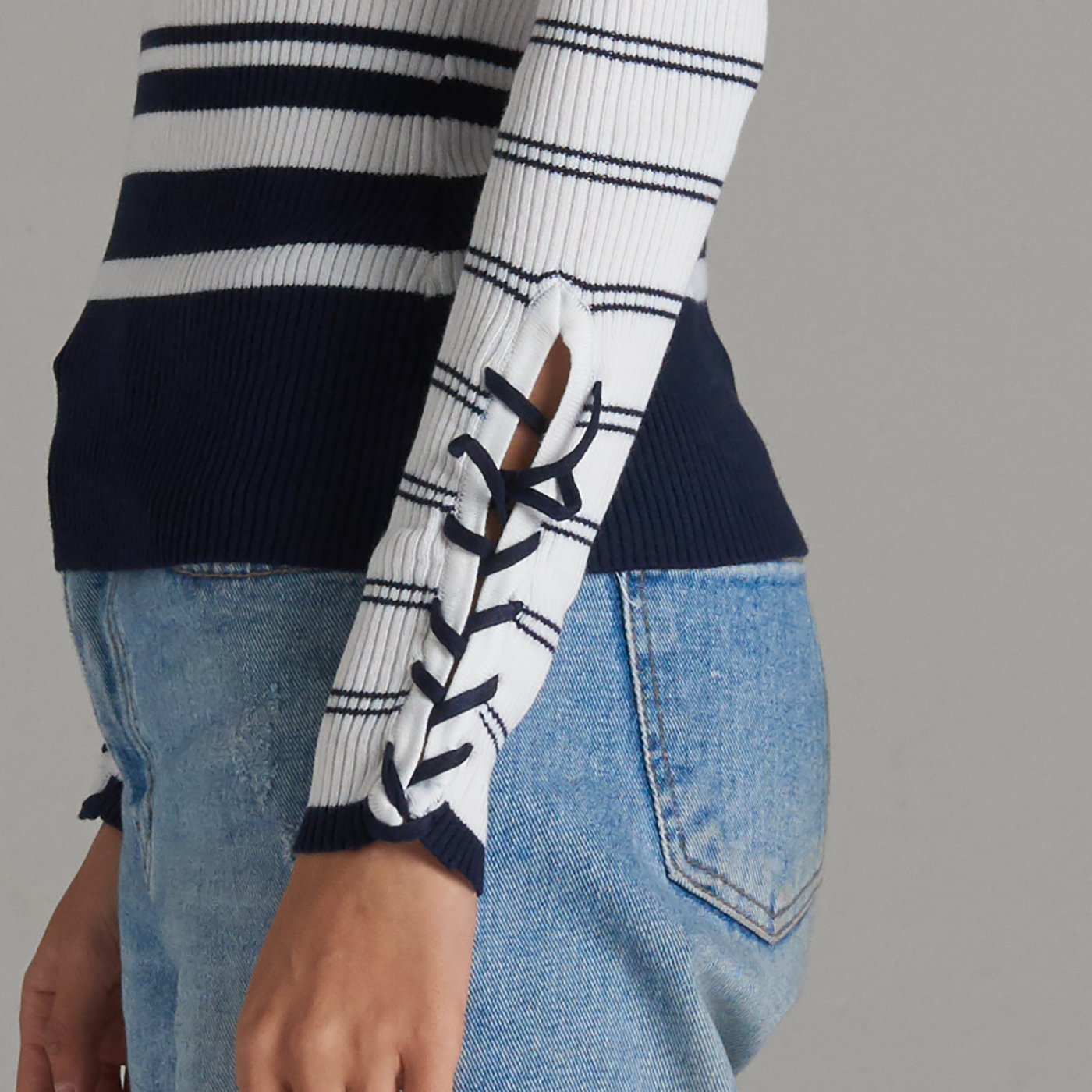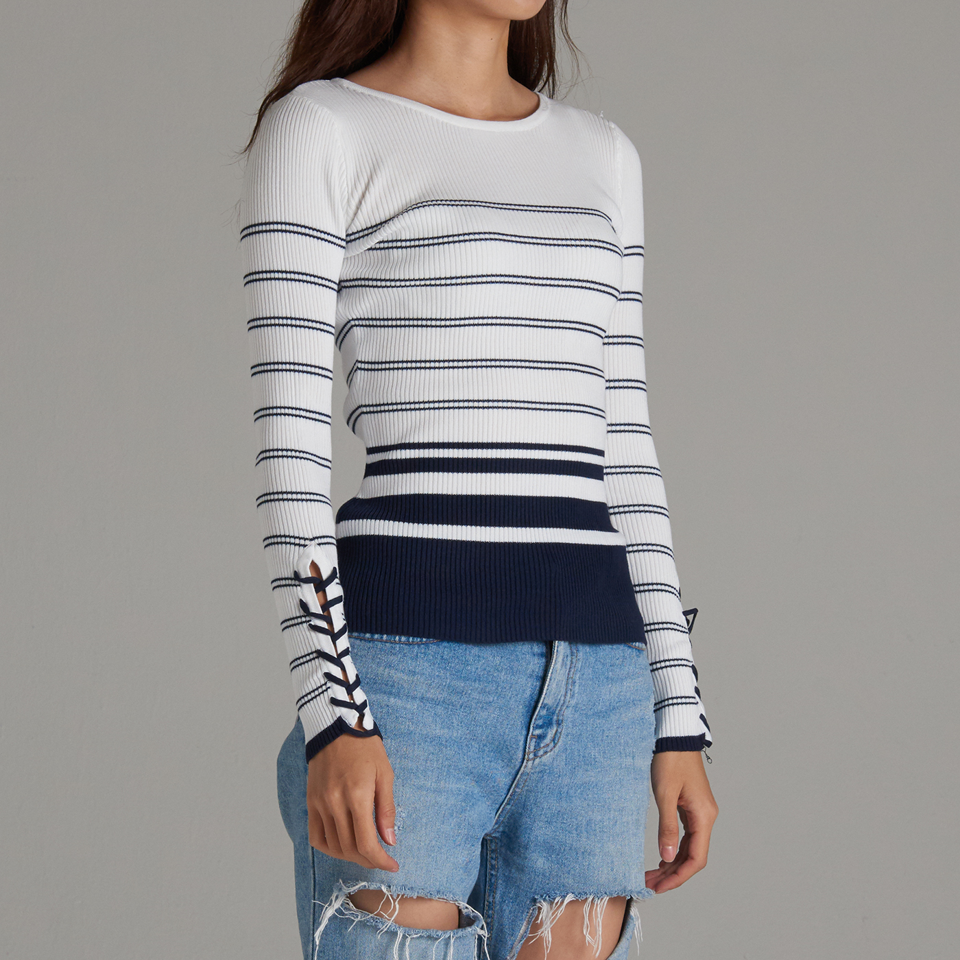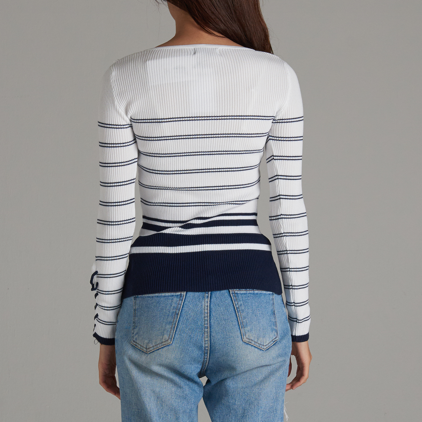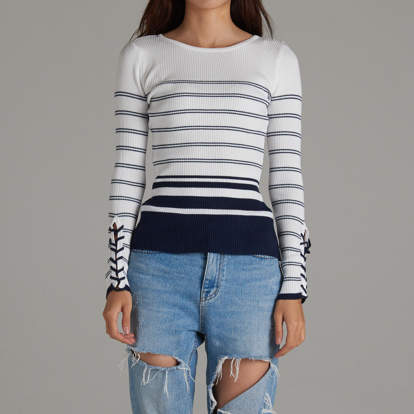 줄무늬의 시크한 디자인과 소매의 리본 디테일이 멋진 니트 탑입니다.