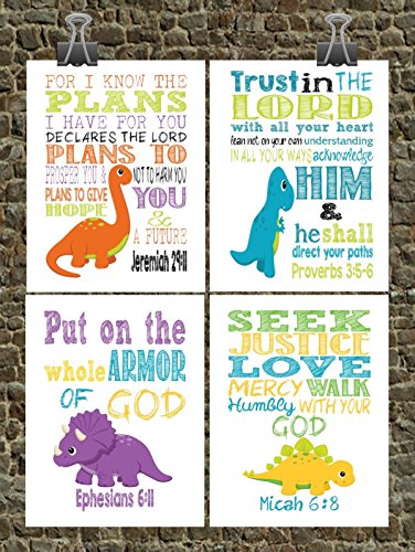 -. Title : Dinosaur Set of 4 - Christian Nursery Decor - Tyrannosaurus Rex, Brontosaurus, Stegosaurus, Triceratops - Bible Verse Nursery, Playroom or Kids Room Decor