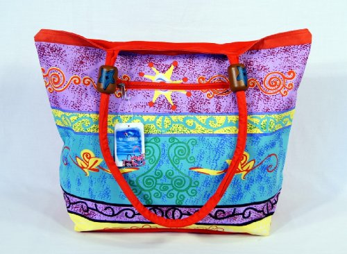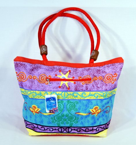 Waterproof Purple Blue Design on front side and Solid red on flip side Canvas Beach Bag Zipper Closure with Wood Balls 21 X 15 X 6"