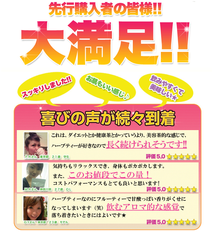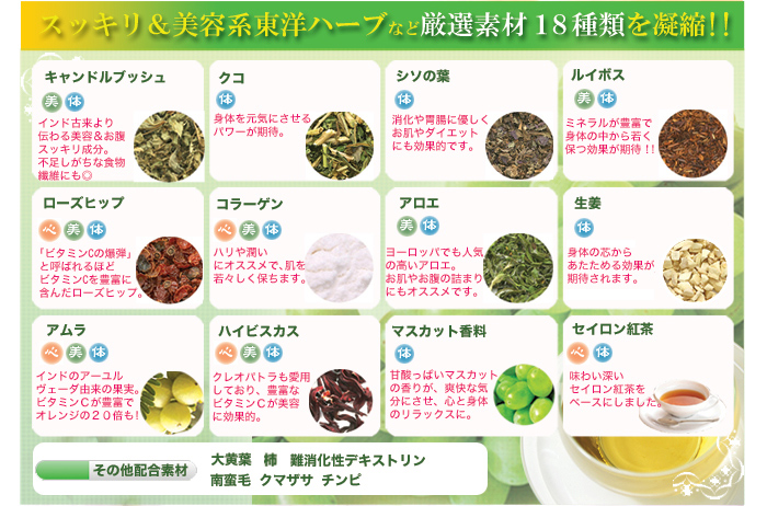●原材料名:キャンドルブッシュ・セイロン紅茶・デキストリン・ローズヒップ・ルイボスティー・大黄葉・香料・コラーゲン・ジンジャー・柿・クマザサ・シソの葉・ハイビスカス・チンピ・クコ・南蛮毛・アロエ・アムラ