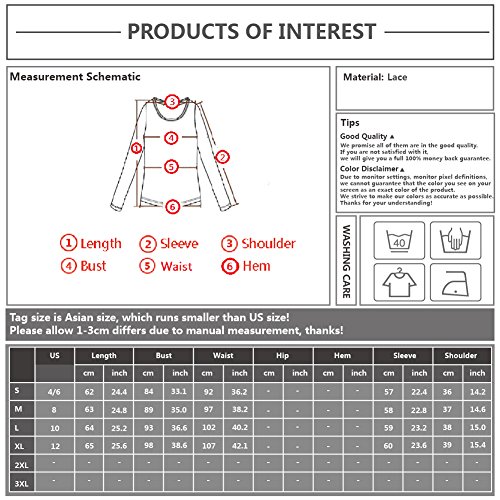 Fabric: Lace Long Sleeve, Full Lace, Sexy and Comfortable, Sweatshirt, Henley Top Blouse The Products without the Trademark is Counterfeit. Season: Spring, Fall, and Winter Garment Care: Machine washable / Hand wash recommended / Do not bleach We promise all of them are in the good quality. If you are not satisfied with it, we will give you a full 100% money back guarantee. If you are satisfied with our product, pls. give us feedback and let other customers to know how good the product is. If our product is unsatisfactory, pls. do not hesitate to let us know, we'll do our best to improve the quality and services based on customer's feedback. About Color: Due to monitor settings, monitor pixel definitions, we cannot guarantee that the color you see on your screen as an exact color of the product. About size: Pls get measured before placing an order.? Tag size is Asian size, which runs much smaller than US/CA size, the size chart gives the corresponding US/CA size for your reference. If you run between sizes and are not sure what size to get, we would suggest going up a size. 0 |