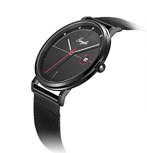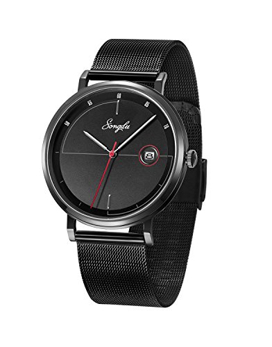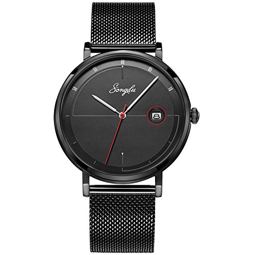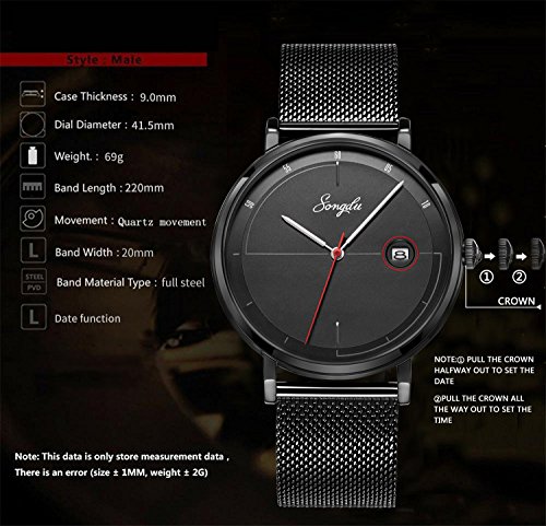 Brand, Seller, or Collection Name:SONGDU Part Number:SD-9237-BDBB Item Shape:Round Display Type:Analog Case material:Stainless steel Case diameter:40 millimeters Case Thickness:6.6 millimeters Band Material:Stainless steel Band length:Men's Standard Band width:20 millimeters Band Color:Black Dial color:Black Bezel material:Stainless steel Calendar:Date Special features:waterproof, scratch-proof, Shock resistant Movement:Japanese quartz Water resistant depth:30 Meters