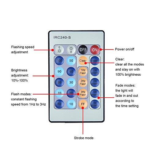 - Key Functions of The Remote: Brightness+, Brightness-, On/Off, 0-100% brightness, Clear, 1 Hz Flash,2 Hz Flash,3 Hz Flash, FF(strobe mode), Smooth, 20s smooth, 15s smooth, 10s smooth and 5s smooth.
