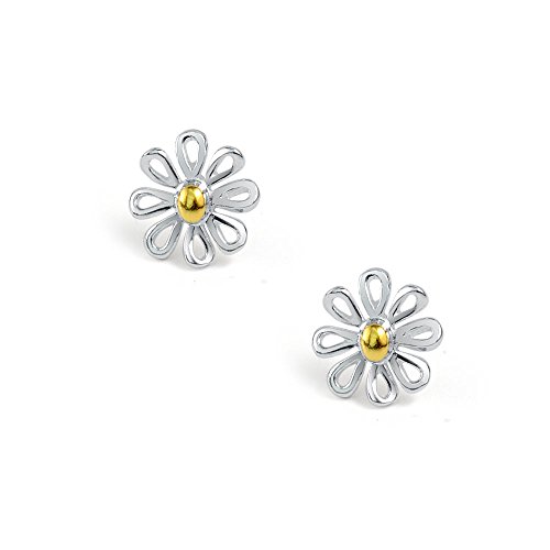 Fun and floral. These adorable daisy earrings are made of .925 sterling silver with gold plated in the center. Instead of giving flowers that will wilt buy her these beautiful sterling silver flower earrings that will last a lifetime. The gold accent with sterling silver detail that make up the petals of the flower give you the versatility to pair them with either gold or silver jewelry. Springtime and Mothers Day are the perfect time to give these precious earrings as gifts. These flower studs are perfect for any age group. Made for pieced ears.Feature