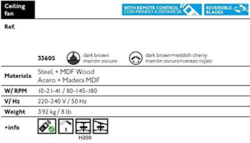 -. Feature : Deckenventilator Lorefar MINI MALLORCA Faro 33605 Motorgehäuse Dunkelbraun / 3 Geschwindigkeitsstufen 80-145-180 Umdrehungen pro Minute bei einer entsprechenden Leistung von 10-21-41 Watt / 4 MDF-Wendeflügel Farbe Dunkelbraun und Kirschholz Durchmesser 106 cm geeignet für Räume bis ca. 13 m2 / Vor- und Rücklauf für Sommer- und Winterbetrieb, Montage auch an schrägen Decken / Inklusive Fernbedienung