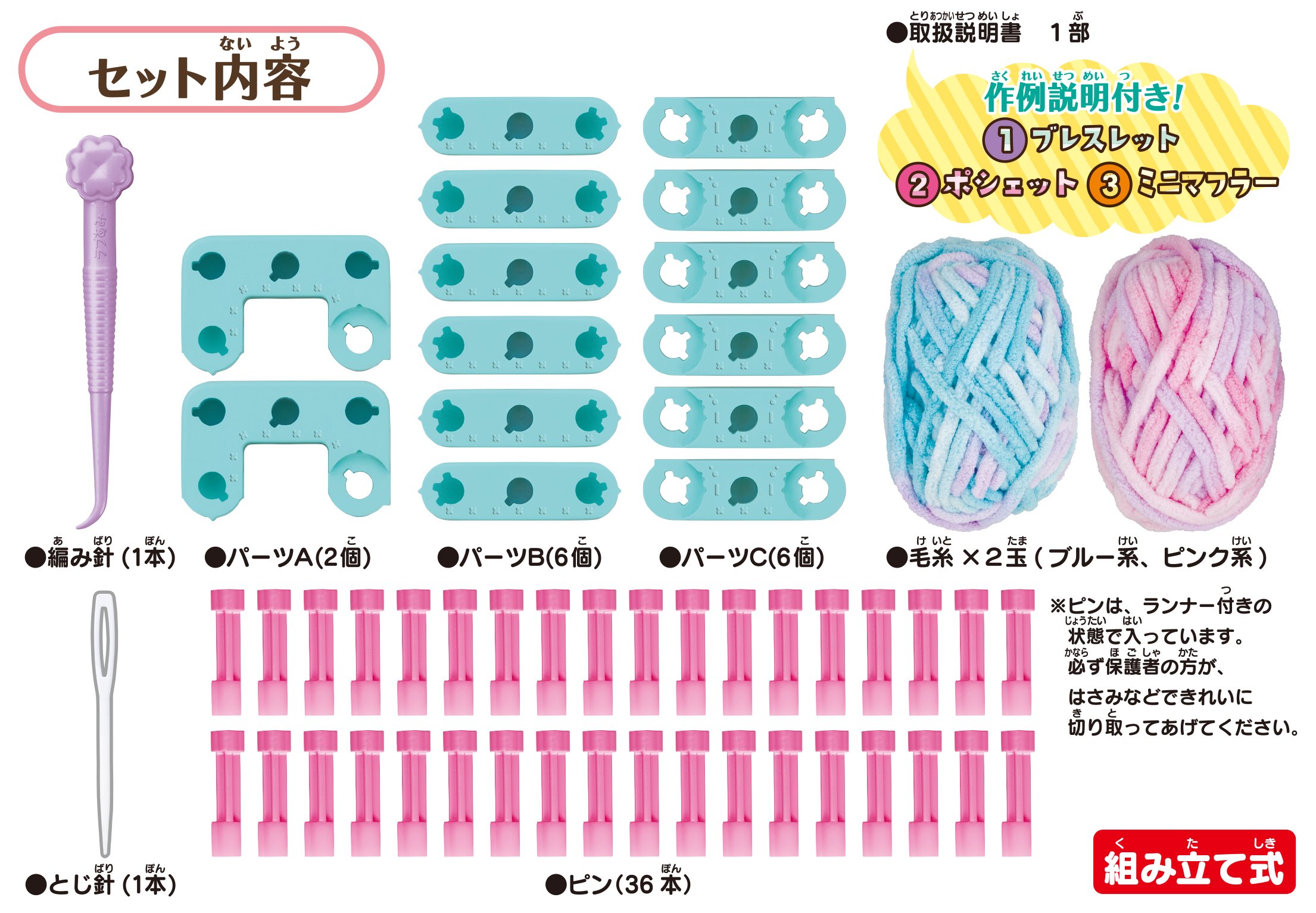 Body parts A × 2, Body part B × 6, Body part C × 6, Pin × 36, knitting needle, bind binding needle, hair ball A, hair ball B, instruction manual