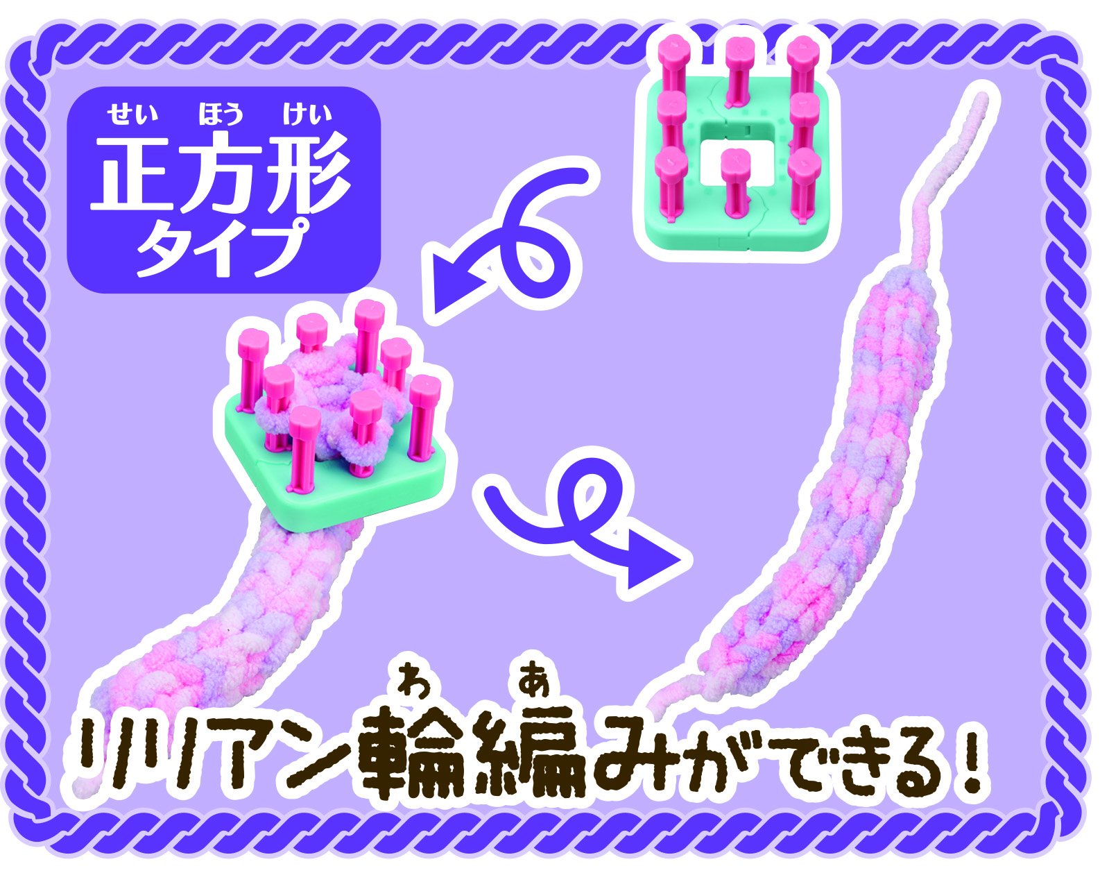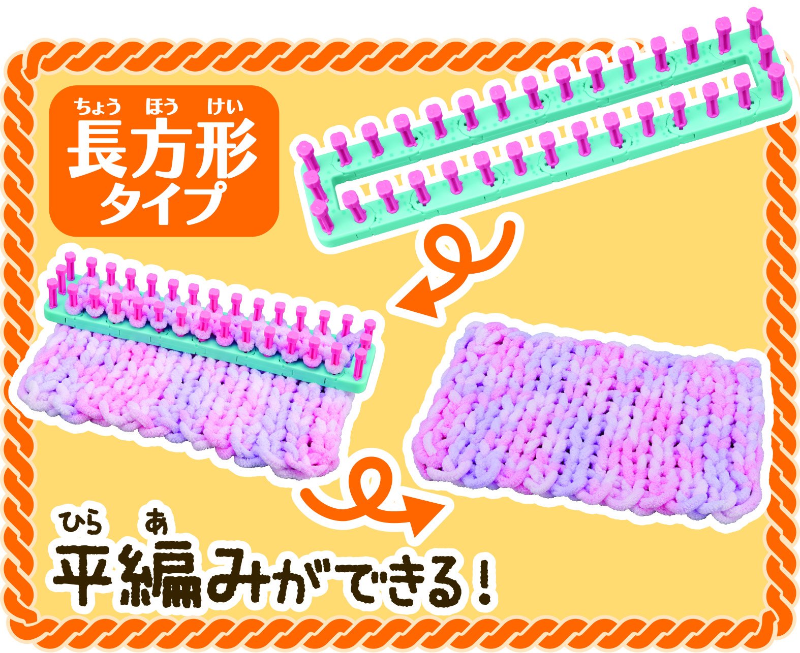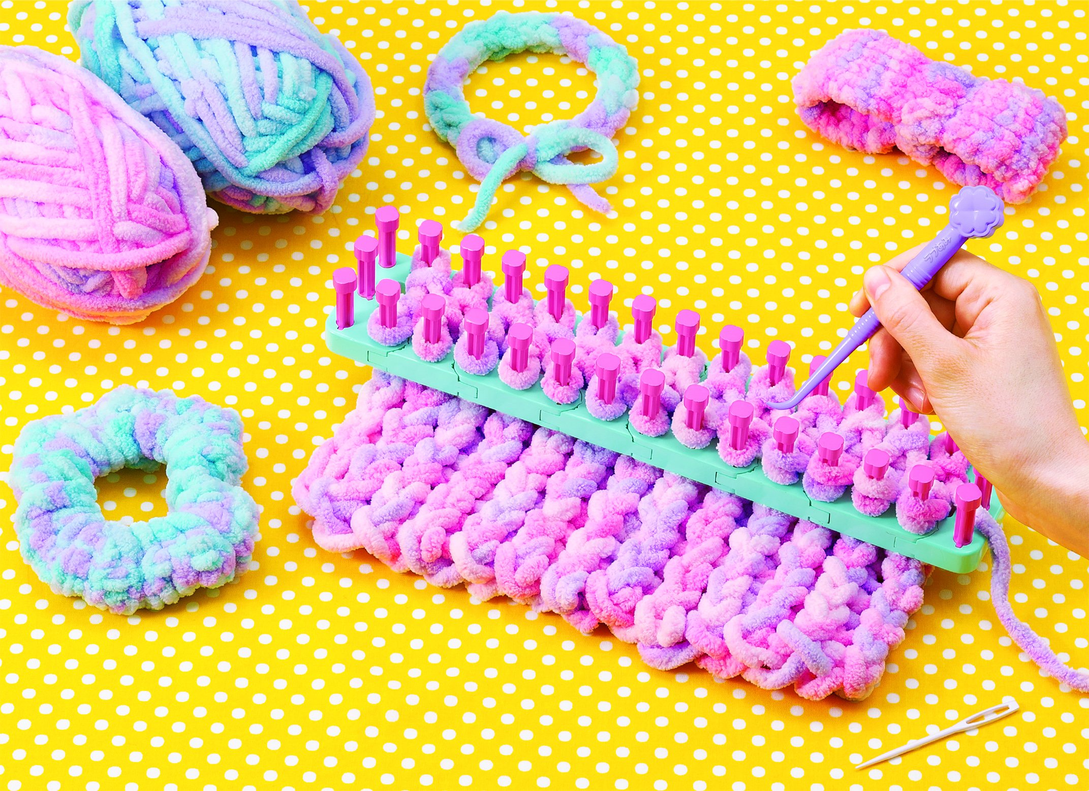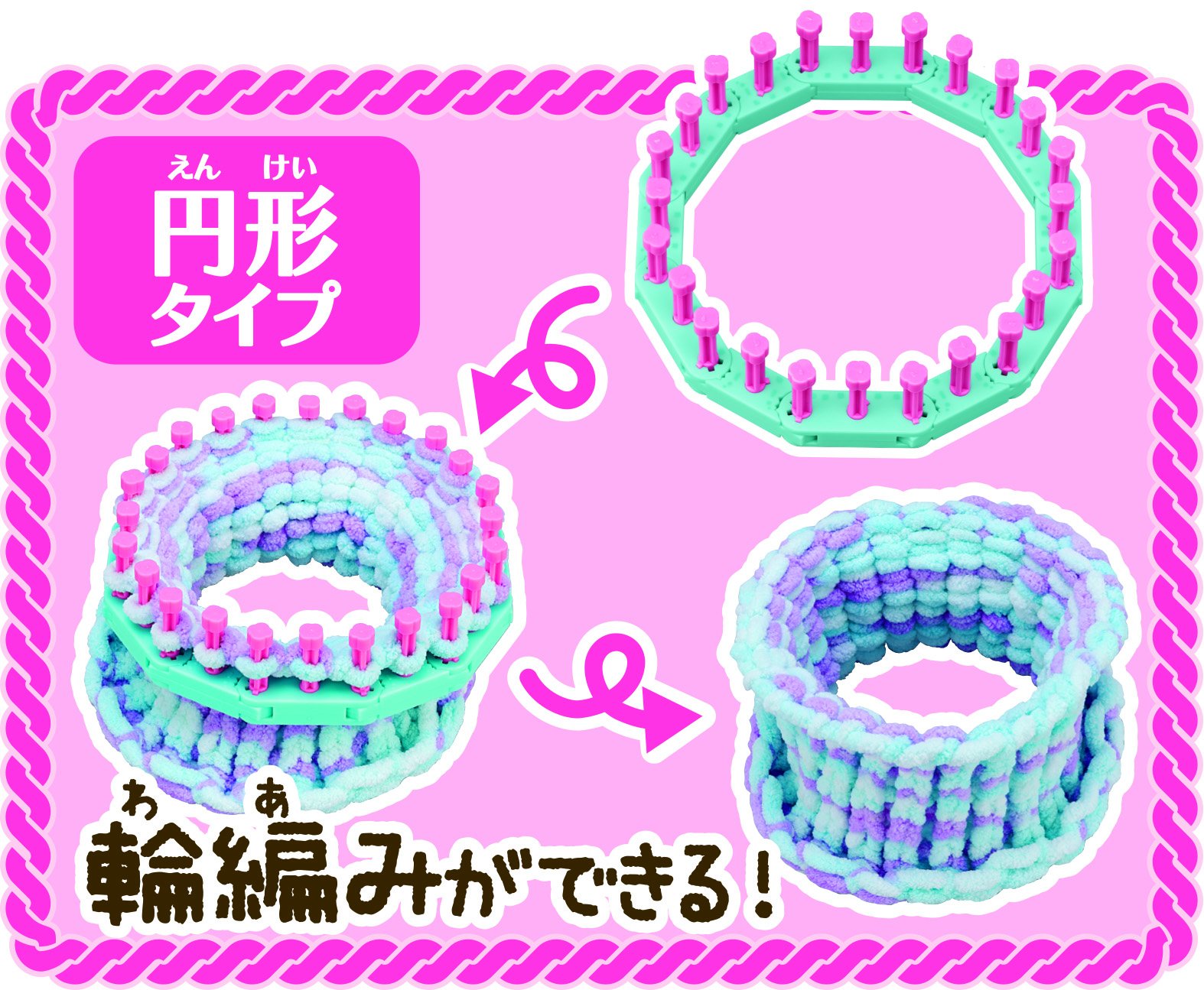 It is a knitting machine that knit accessories such as chouch and hair band can easily be knitted easily!
