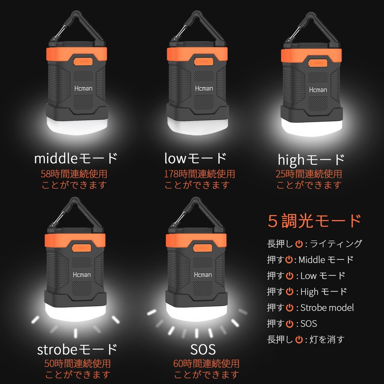 "High mode" (200 lumens) continuous lighting 25 hours; "Middle mode" (58 lumens) continuous lighting 64 hours; "Low mode" (24 lumens) continuous lighting 178 hours.